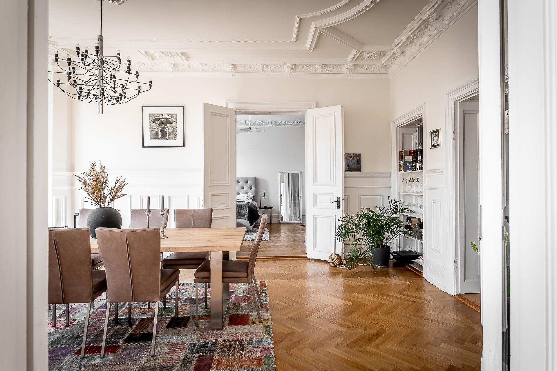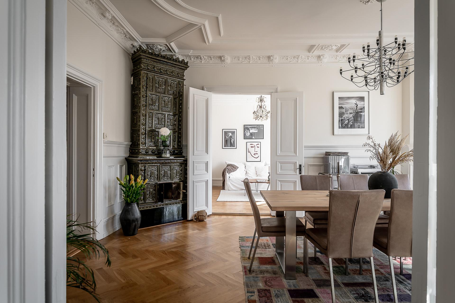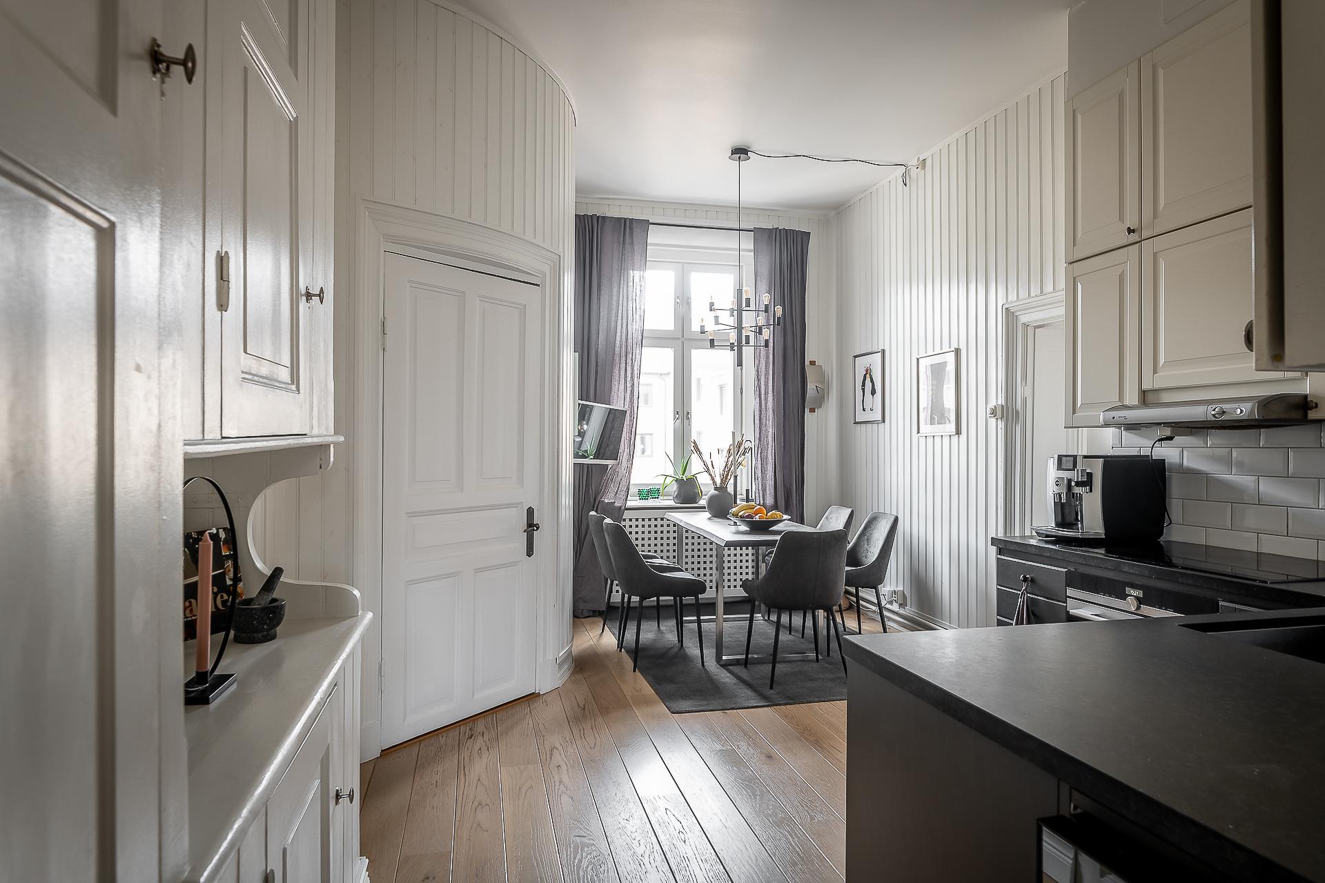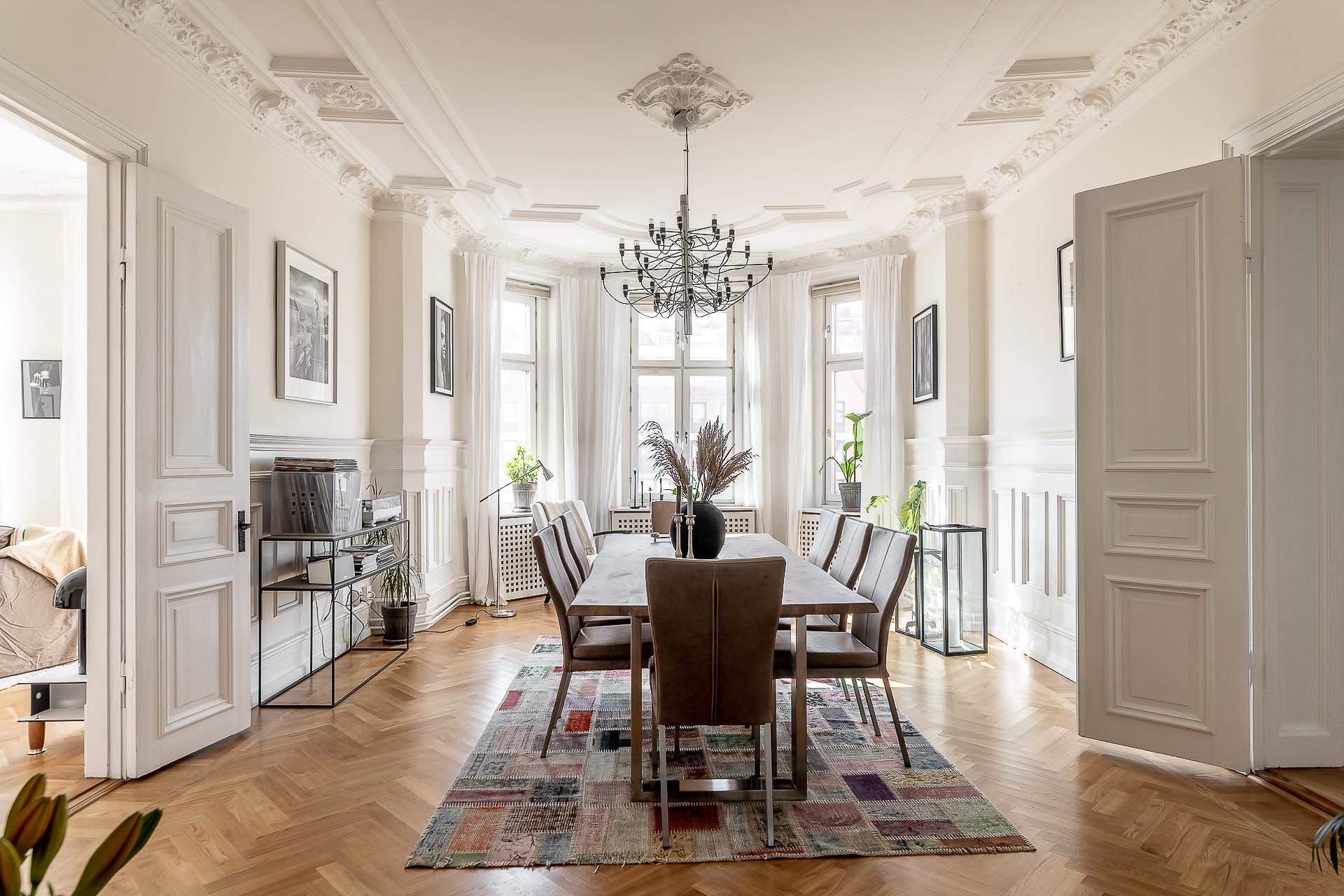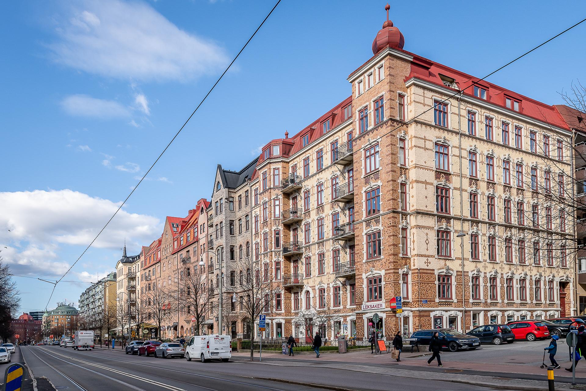 Sekelskiftesfemma om 150 kvadrat på Linnégatans solsida. Högsta ordinarie våningsplan, västerbalkong, serveringsgång, fiskbensparkett, flera rum i fil, badrum med tvättmaskin och gäst-toa. Tre kakelugnar och möjlighet till hela fyra sovrum. Hissen tar dig upp till plan fem och månadsavgiften till lågbelånade Brf Solhörnan är blygsamma 3 237 kr inklusive fiberbredband.