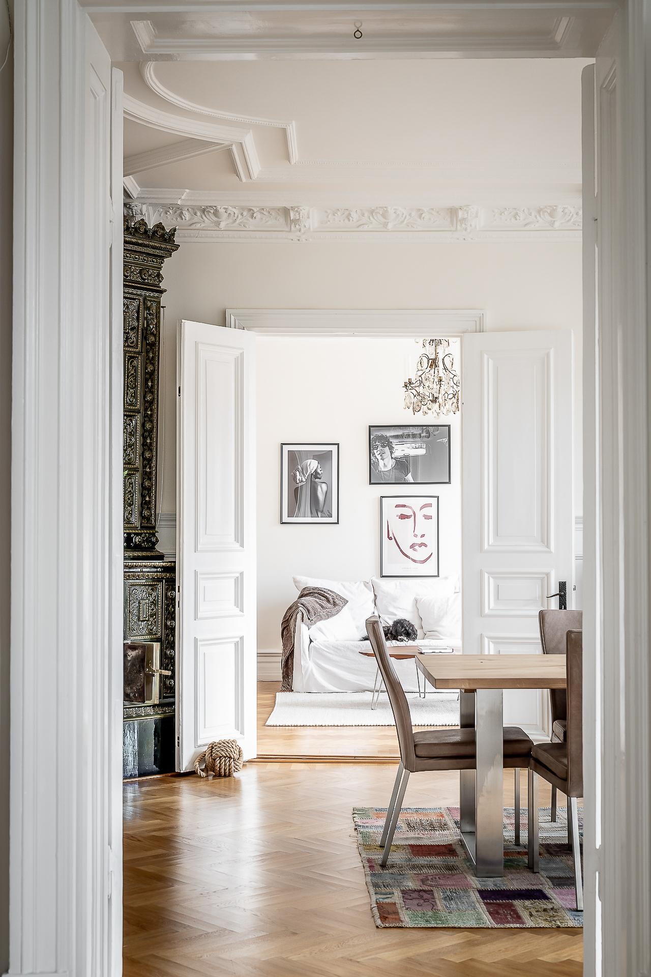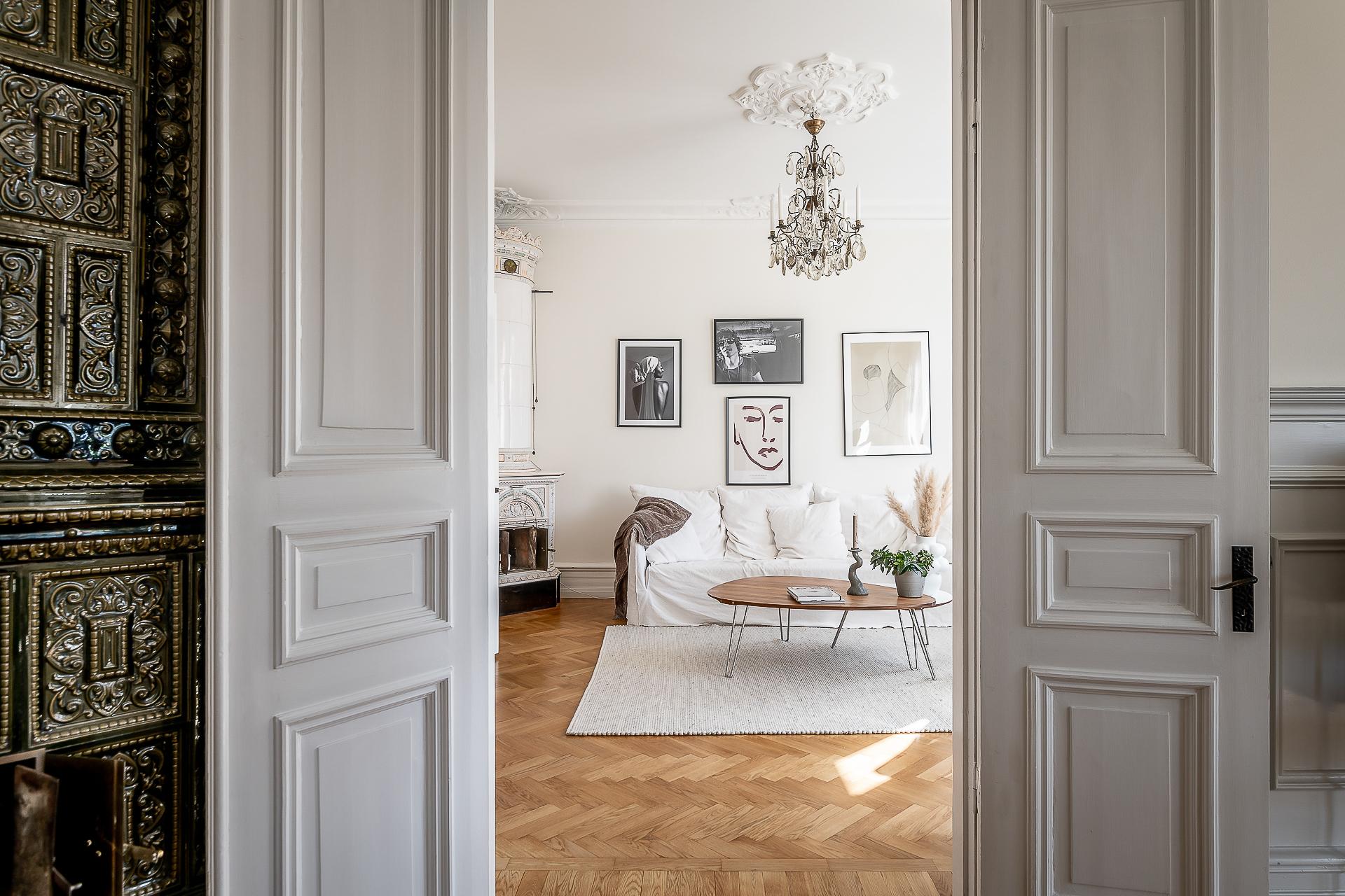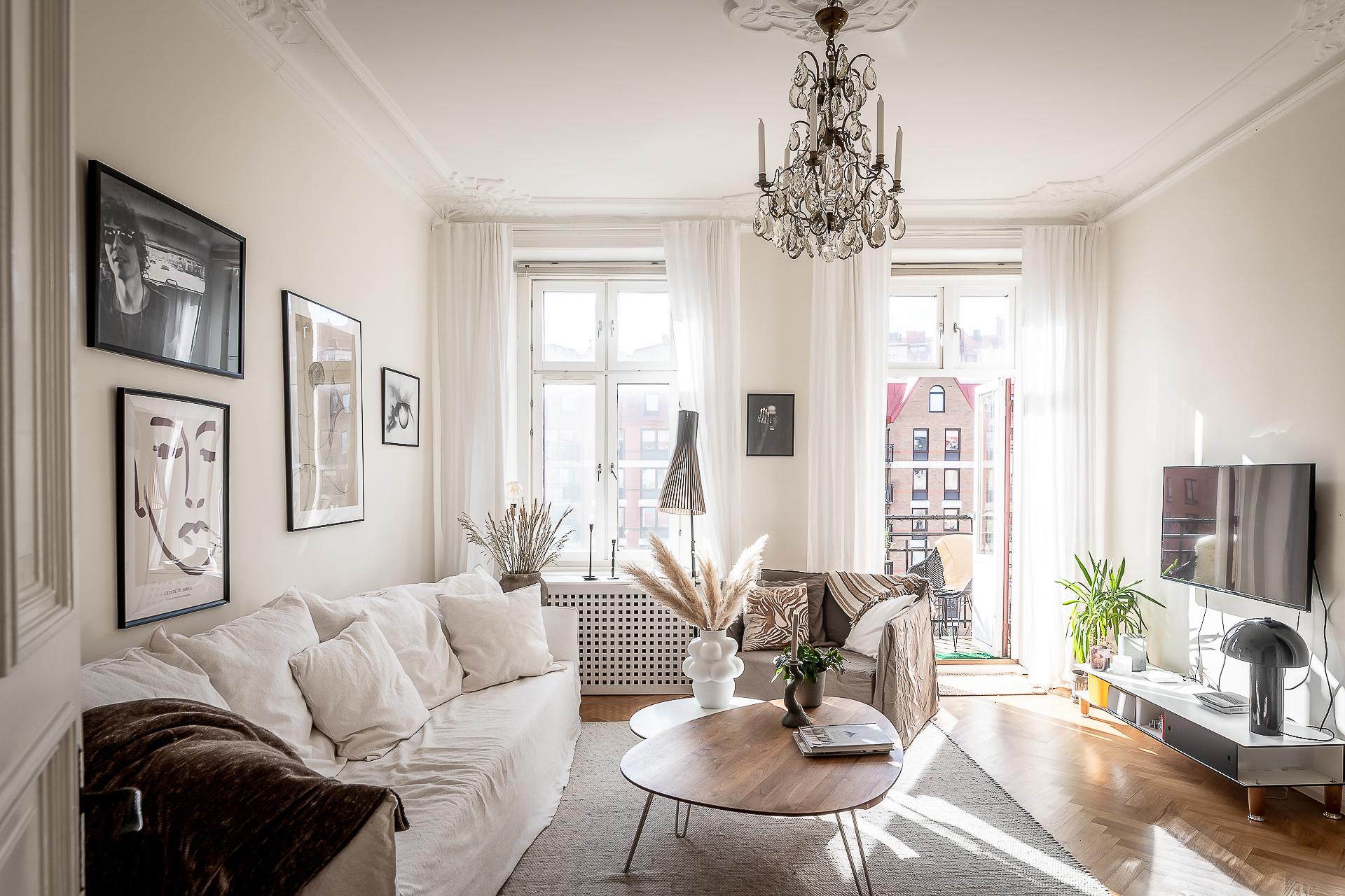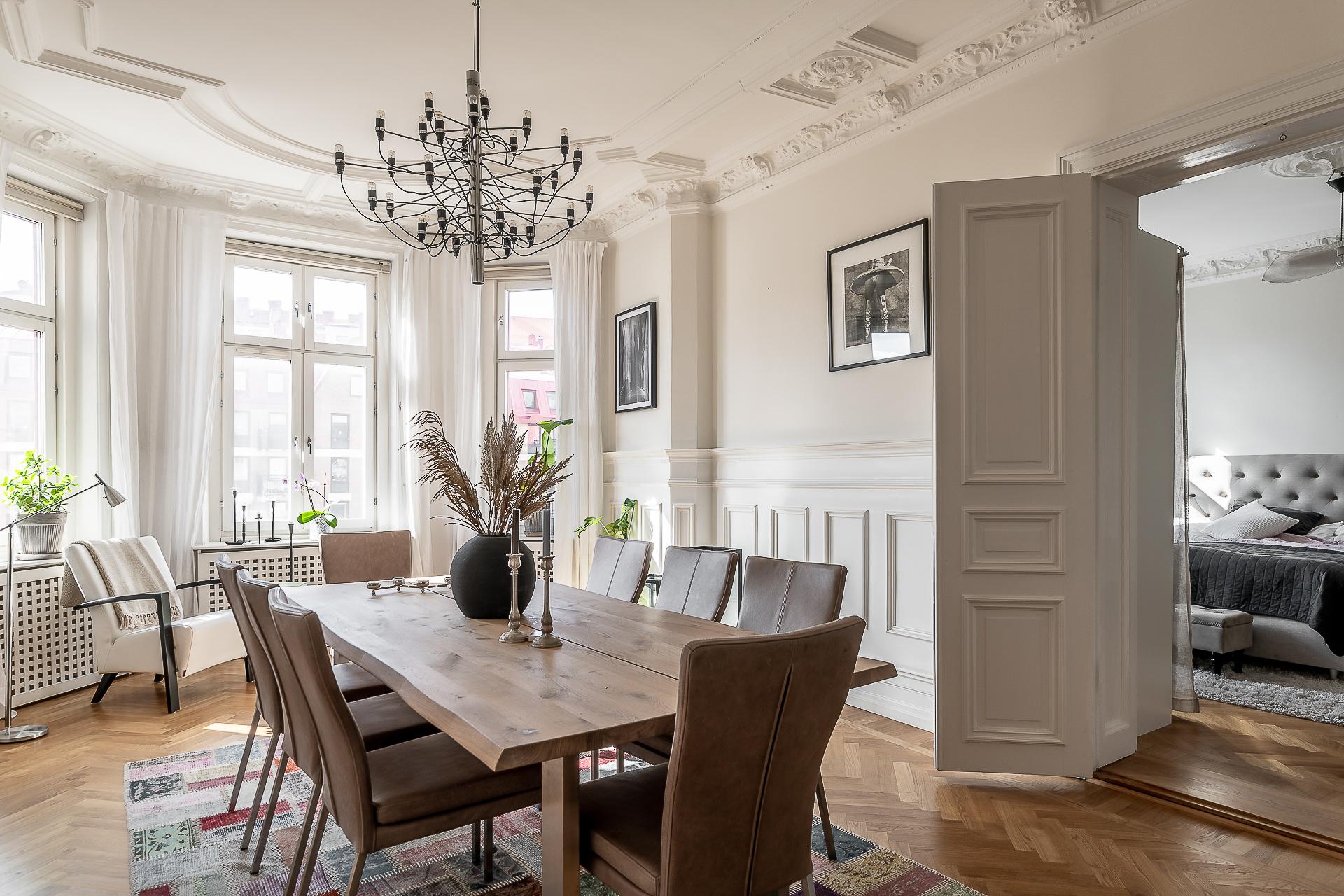 Sekelskiftesfemma om 150 kvadrat på Linnégatans solsida. Högsta ordinarie våningsplan, västerbalkong, serveringsgång, fiskbensparkett, flera rum i fil, badrum med tvättmaskin och gäst-toa. Tre kakelugnar och möjlighet till hela fyra sovrum. Hissen tar dig upp till plan fem och månadsavgiften till lågbelånade Brf Solhörnan är blygsamma 3 237 kr inklusive fiberbredband.