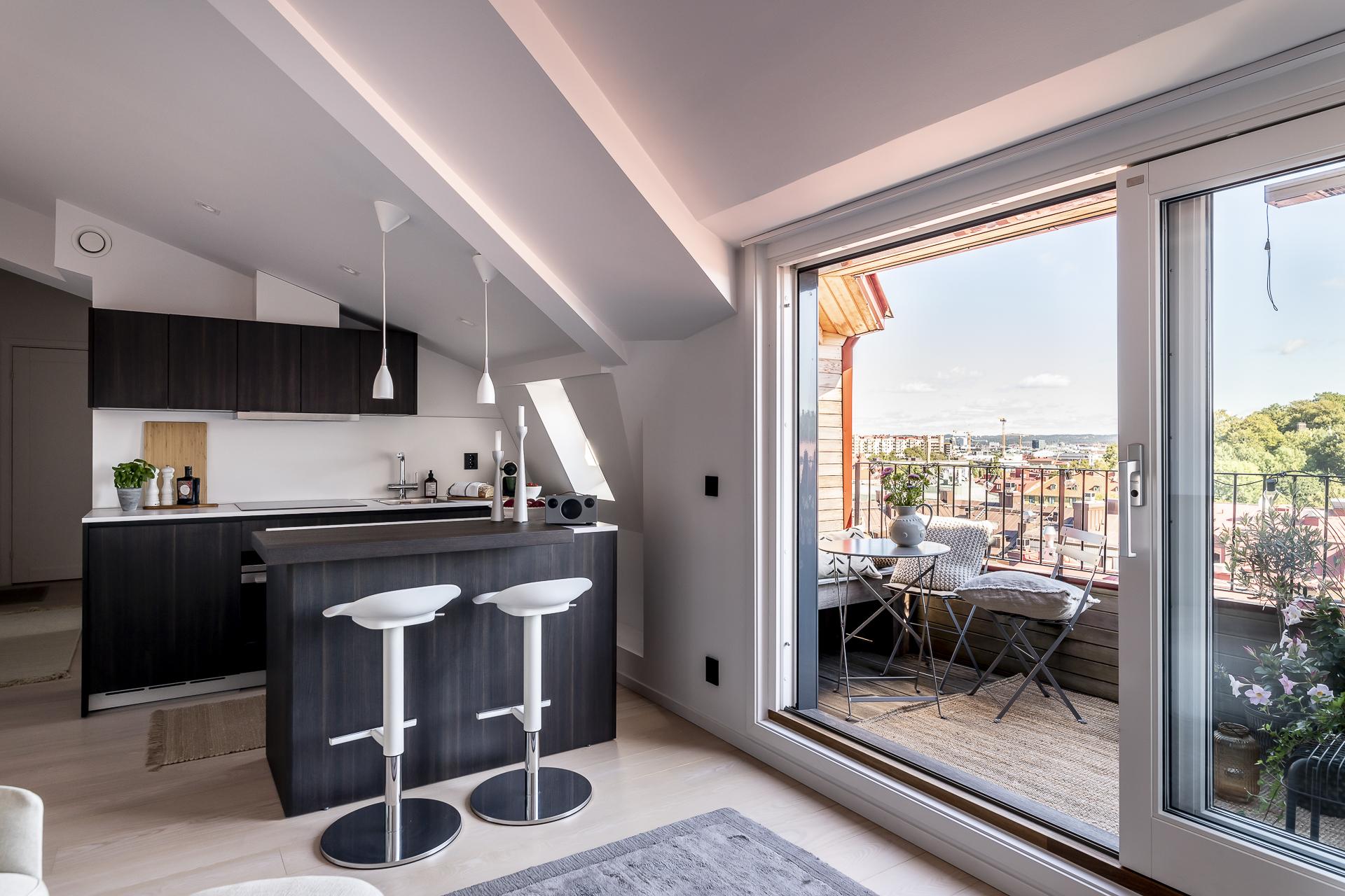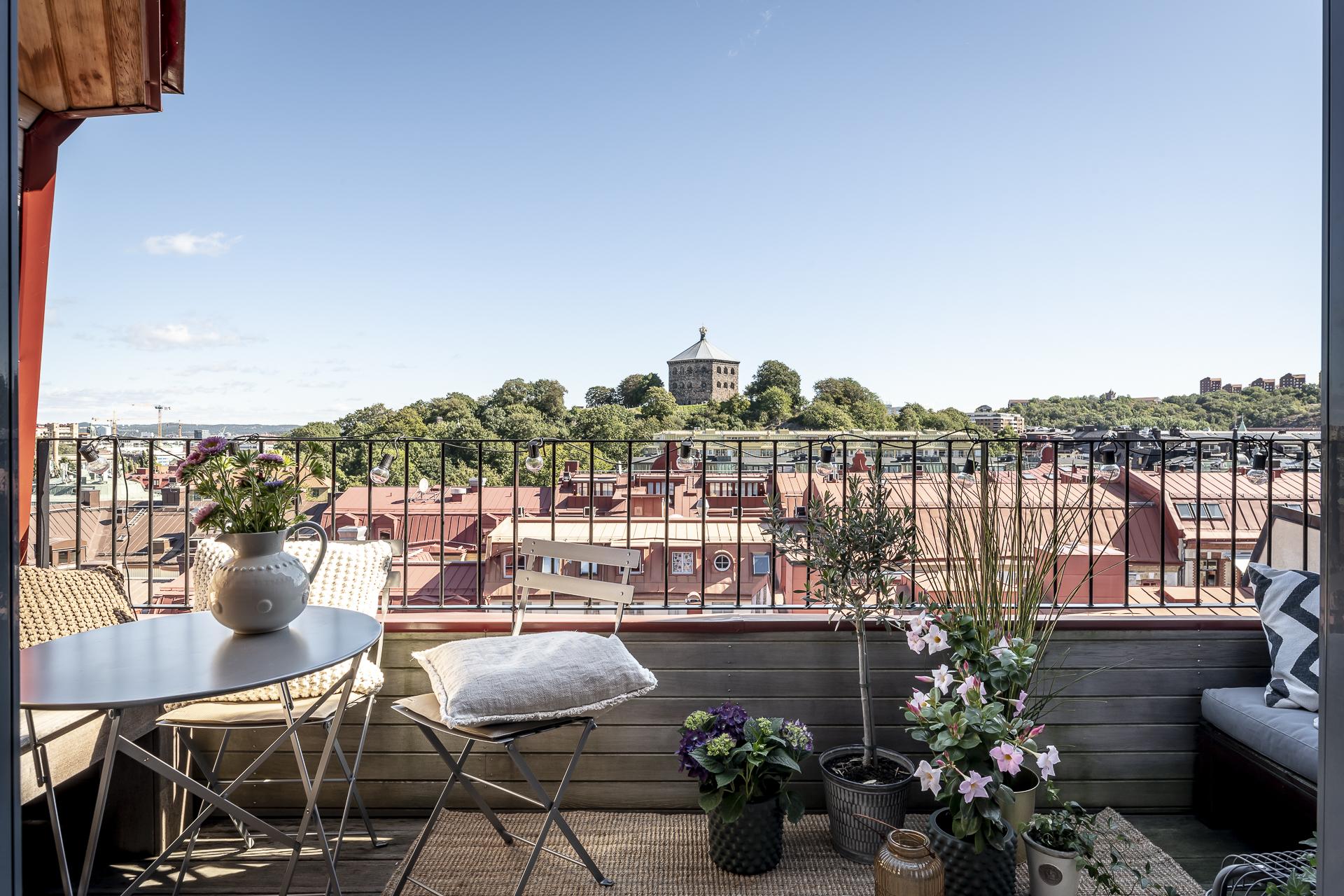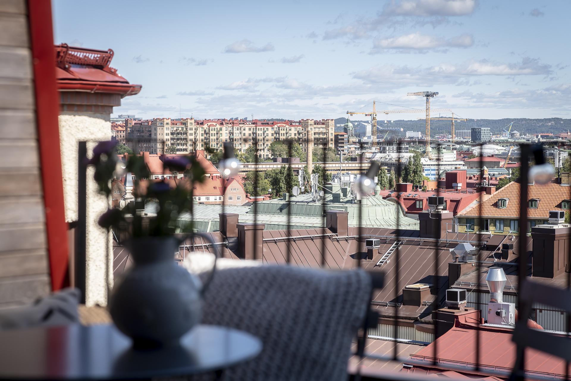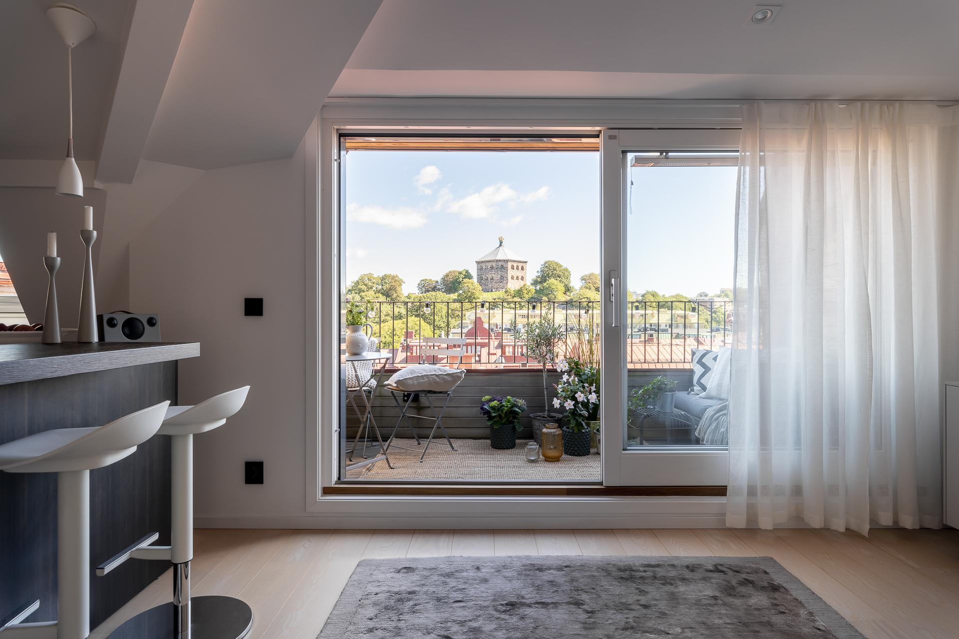 Smarta kvadratmeter i denna fantastiska minitvåa till vindslägenhet. Öppen planlösning med utgång till egen terrass på cirka fem kvadratmeter och med en ljuvlig utsikt över staden. I blickfånget hamnar Skansen Krona och läget är helt. Tillgång till den privata innerstadsparken Kråkängen. Bra förening med låga avgifter och låg belåning. Ej hiss.