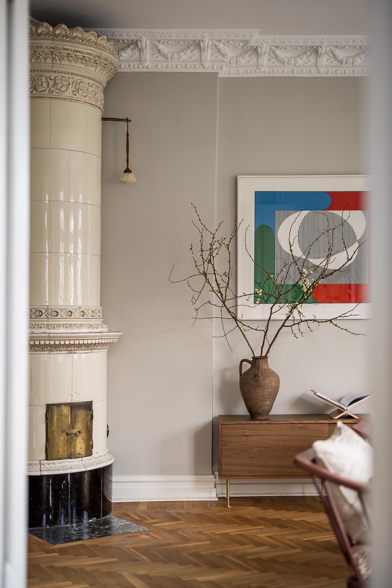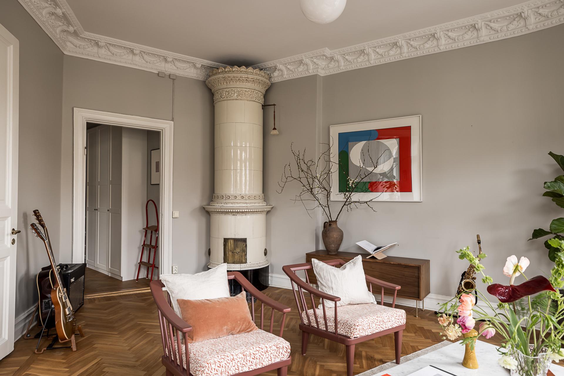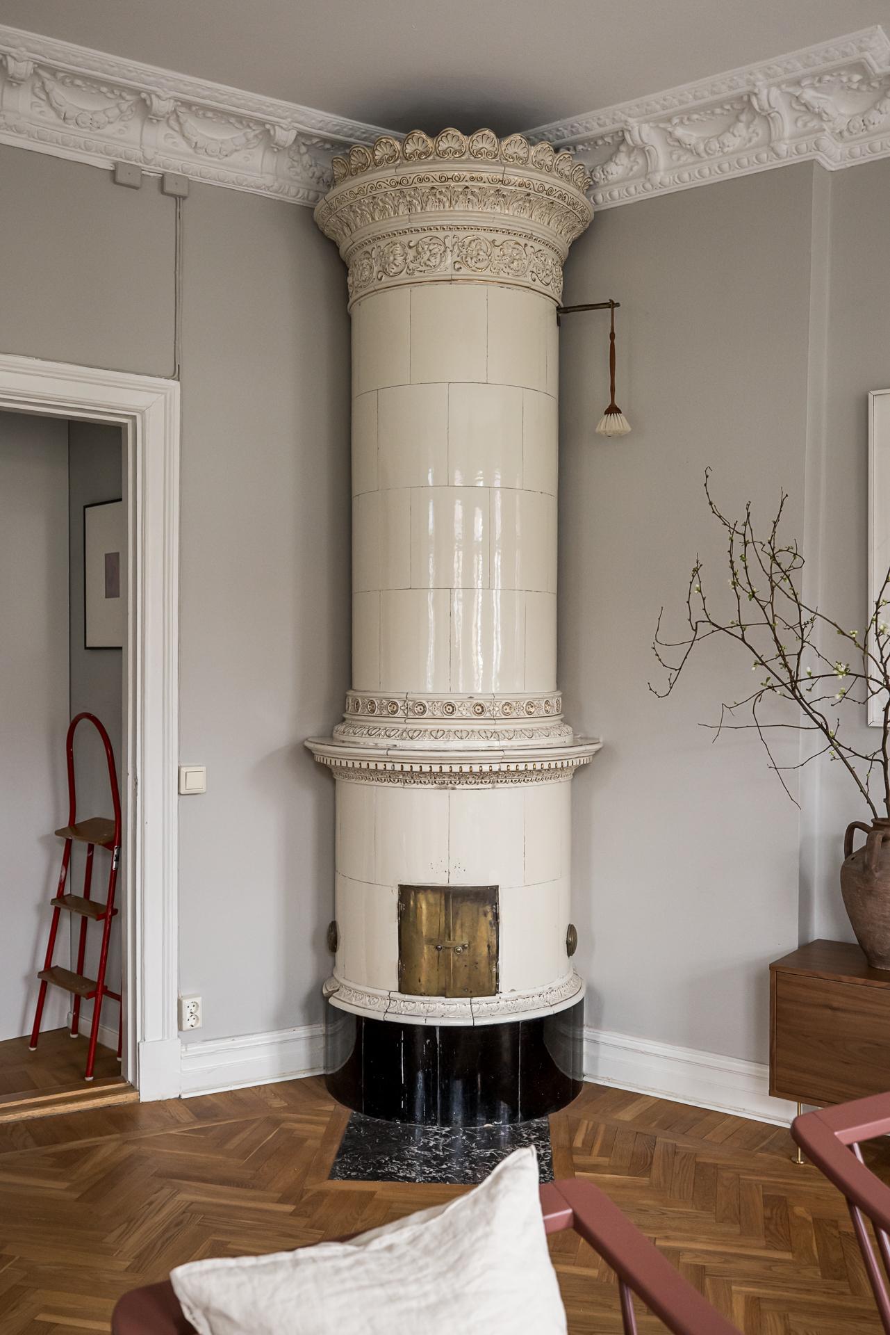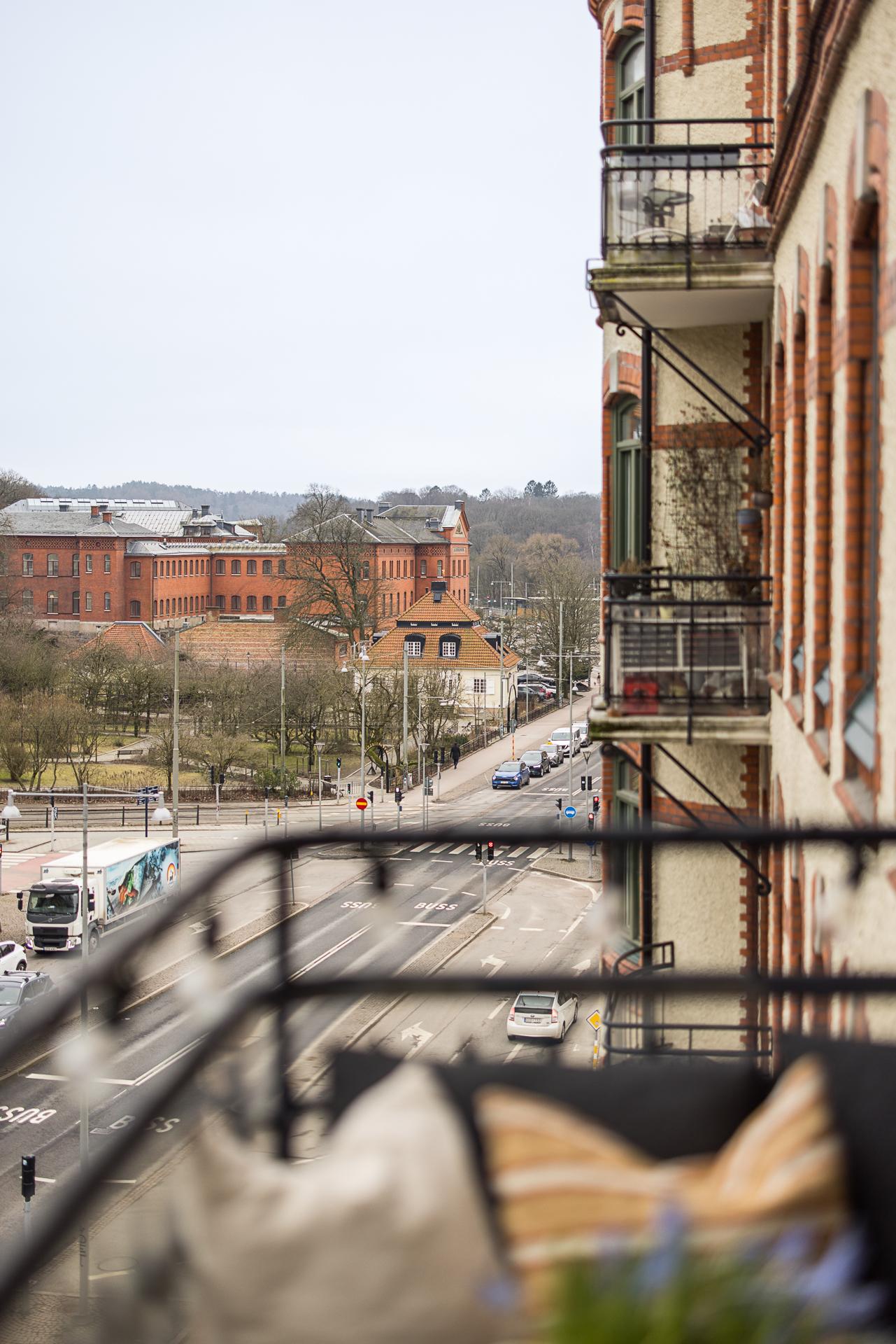 Extremt vacker trea om närmare 100 kvm med öppen planlösning, tornrum och två smidesbalkonger i fin hörnfastighet med hiss till halvplan. Pampiga rum i fil, högt till tak, vackra och maffiga stuckaturer, takrosetter, välvda fönster och pardörrar. Kakelugn finns (ej i bruk för tillfället). Stort kök med köksö och även badrummet håller hög standard med badkar och dusch. Bredband inkluderat i avgiften.