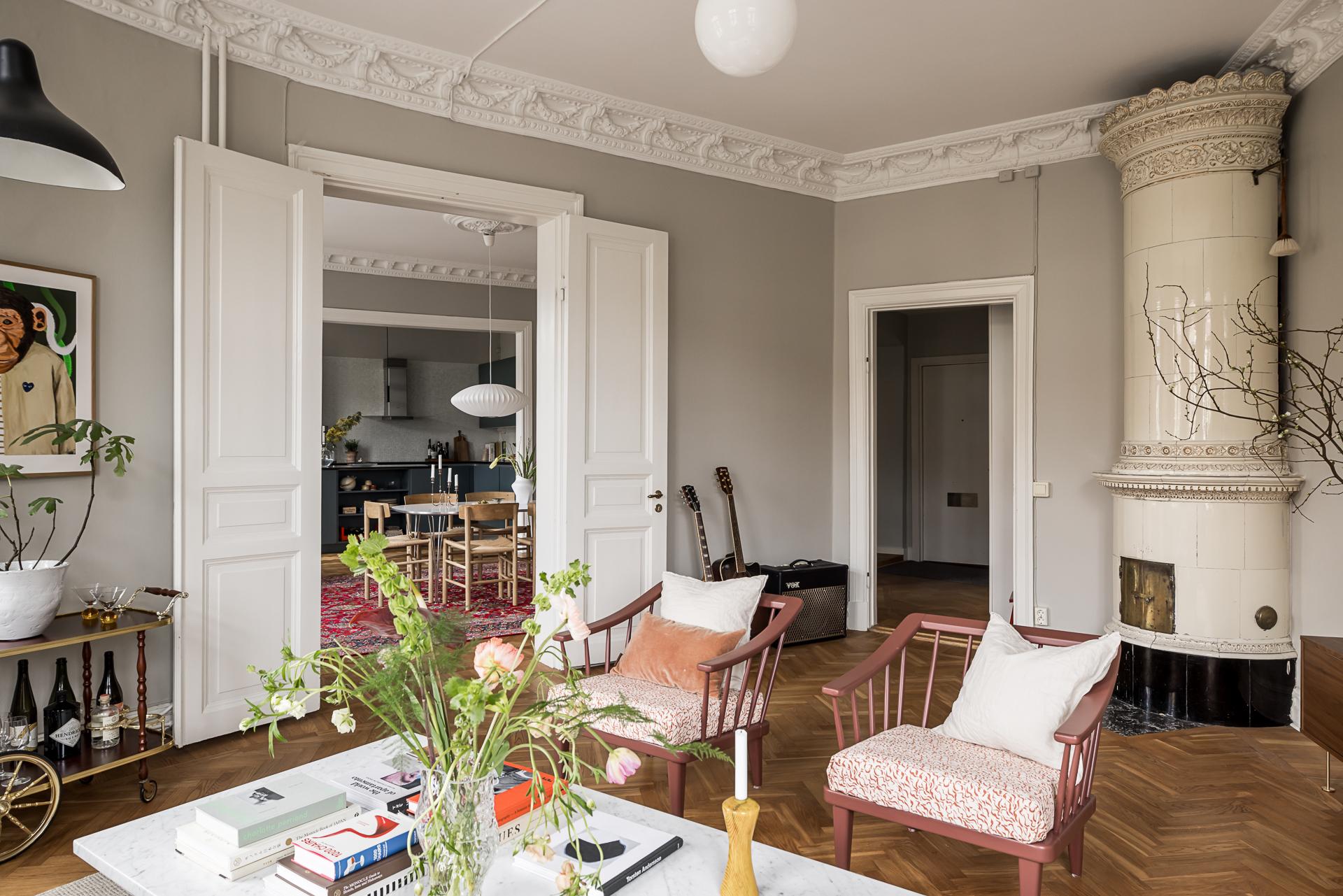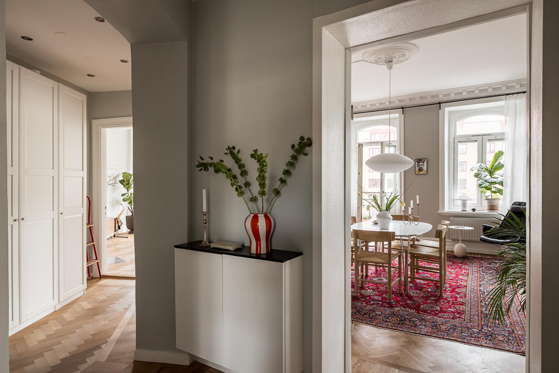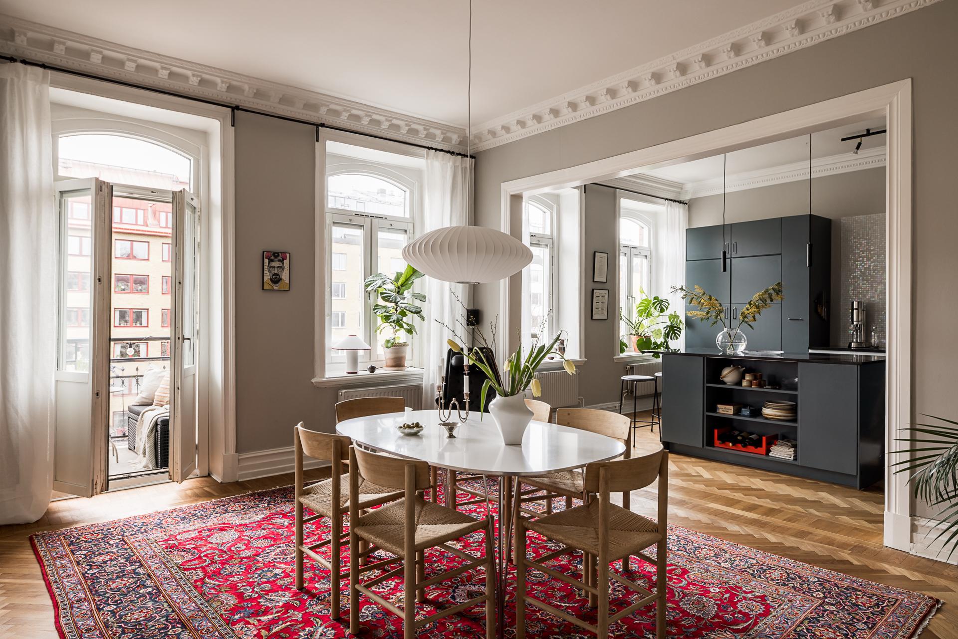 Extremt vacker trea om närmare 100 kvm med öppen planlösning, tornrum och två smidesbalkonger i fin hörnfastighet med hiss till halvplan. Pampiga rum i fil, högt till tak, vackra och maffiga stuckaturer, takrosetter, välvda fönster och pardörrar. Kakelugn finns (ej i bruk för tillfället). Stort kök med köksö och även badrummet håller hög standard med badkar och dusch. Bredband inkluderat i avgiften.