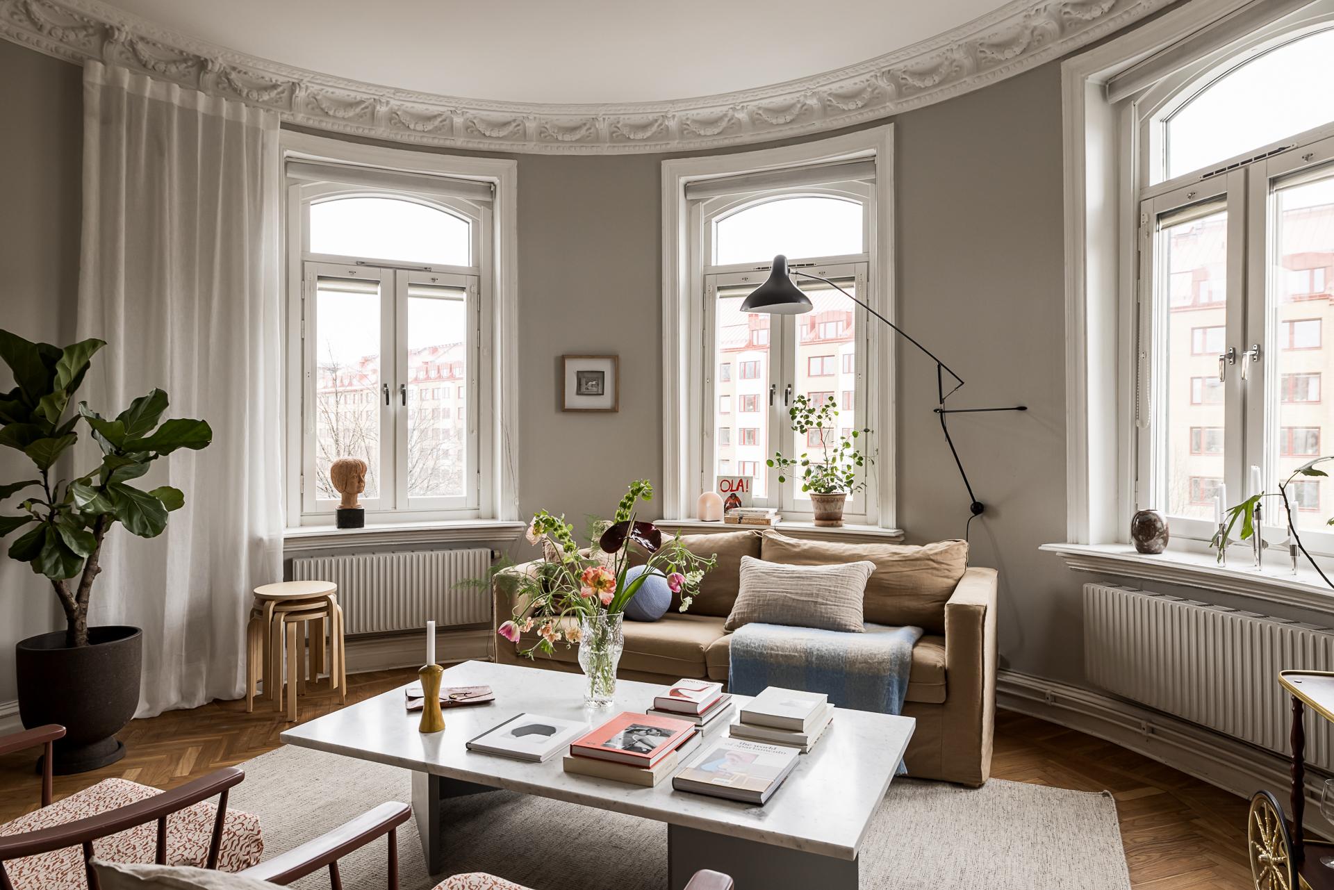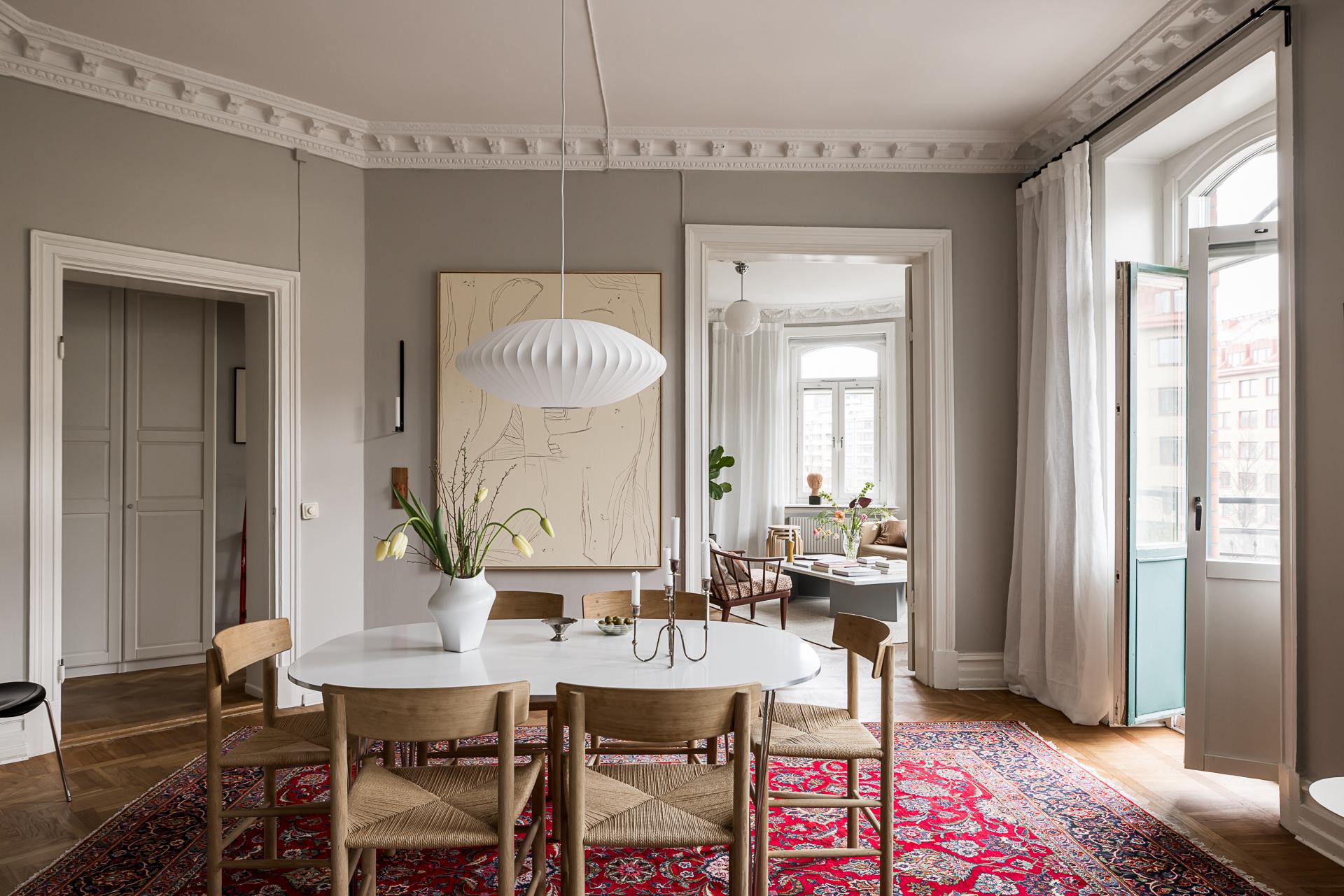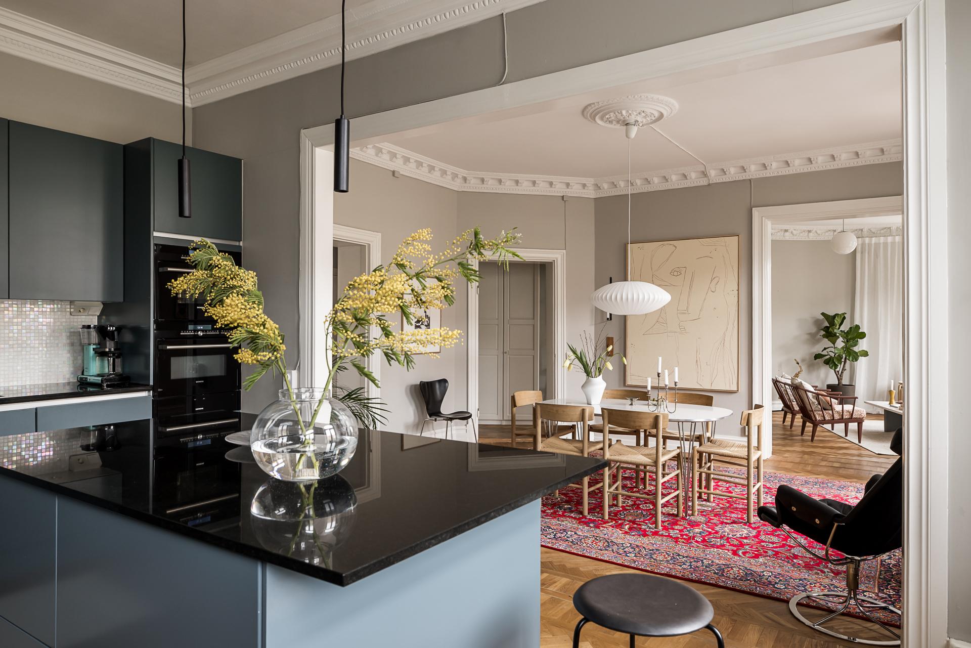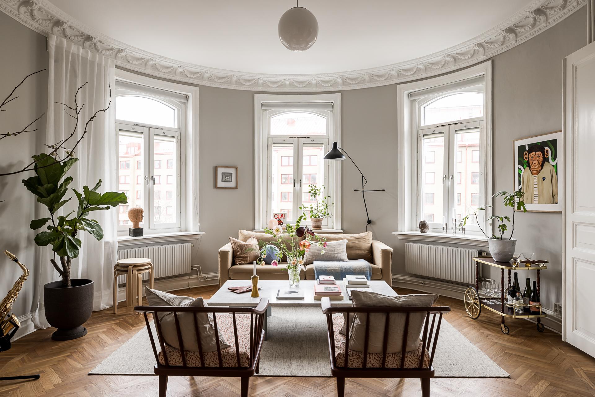 Extremt vacker trea om närmare 100 kvm med öppen planlösning, tornrum och två smidesbalkonger i fin hörnfastighet med hiss till halvplan. Pampiga rum i fil, högt till tak, vackra och maffiga stuckaturer, takrosetter, välvda fönster och pardörrar. Kakelugn finns (ej i bruk för tillfället). Stort kök med köksö och även badrummet håller hög standard med badkar och dusch. Bredband inkluderat i avgiften.