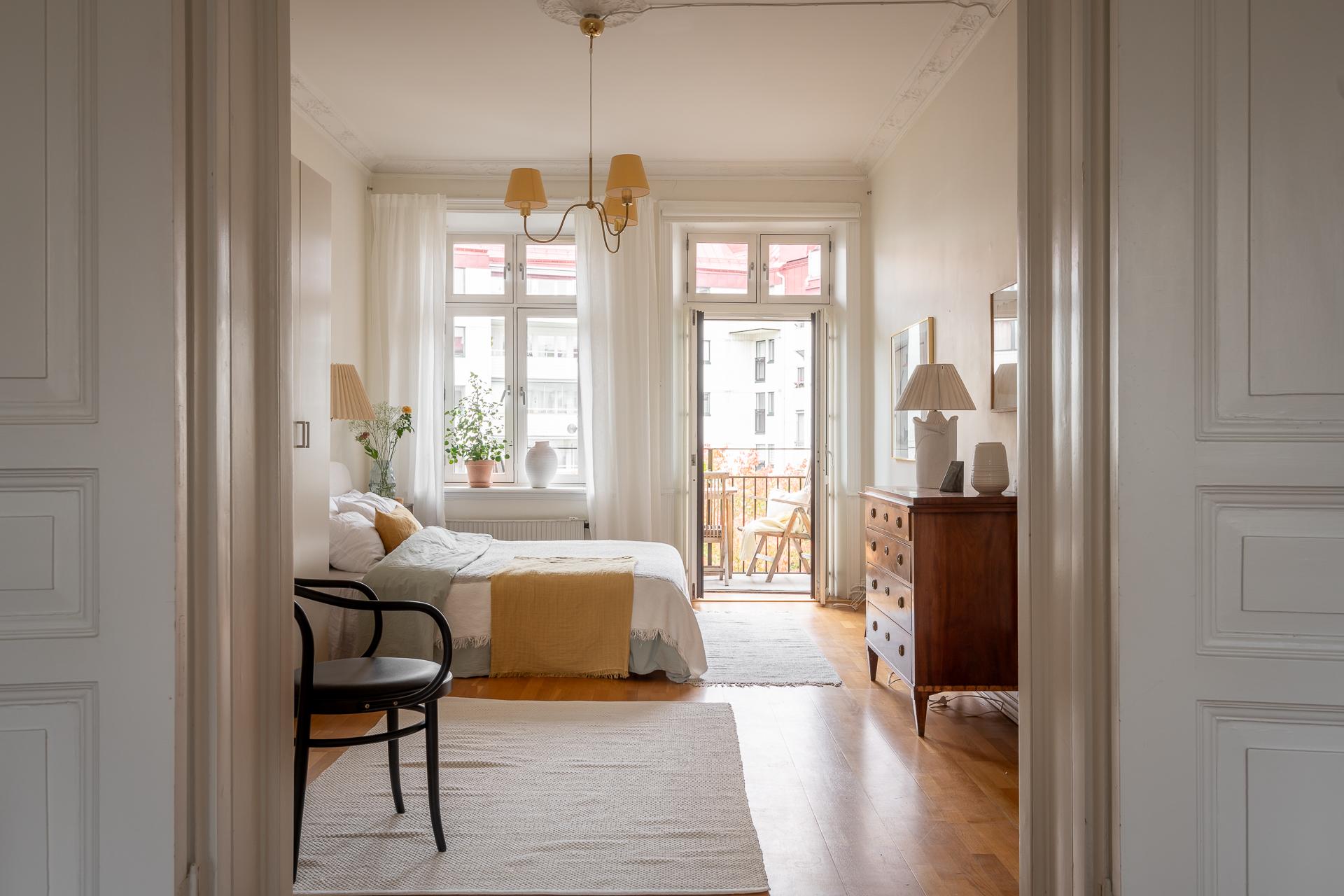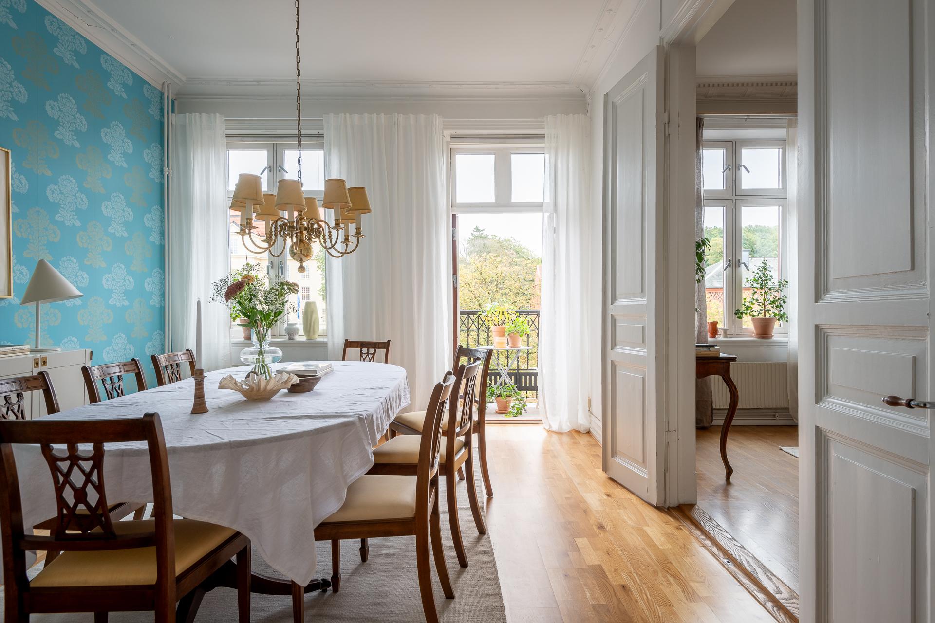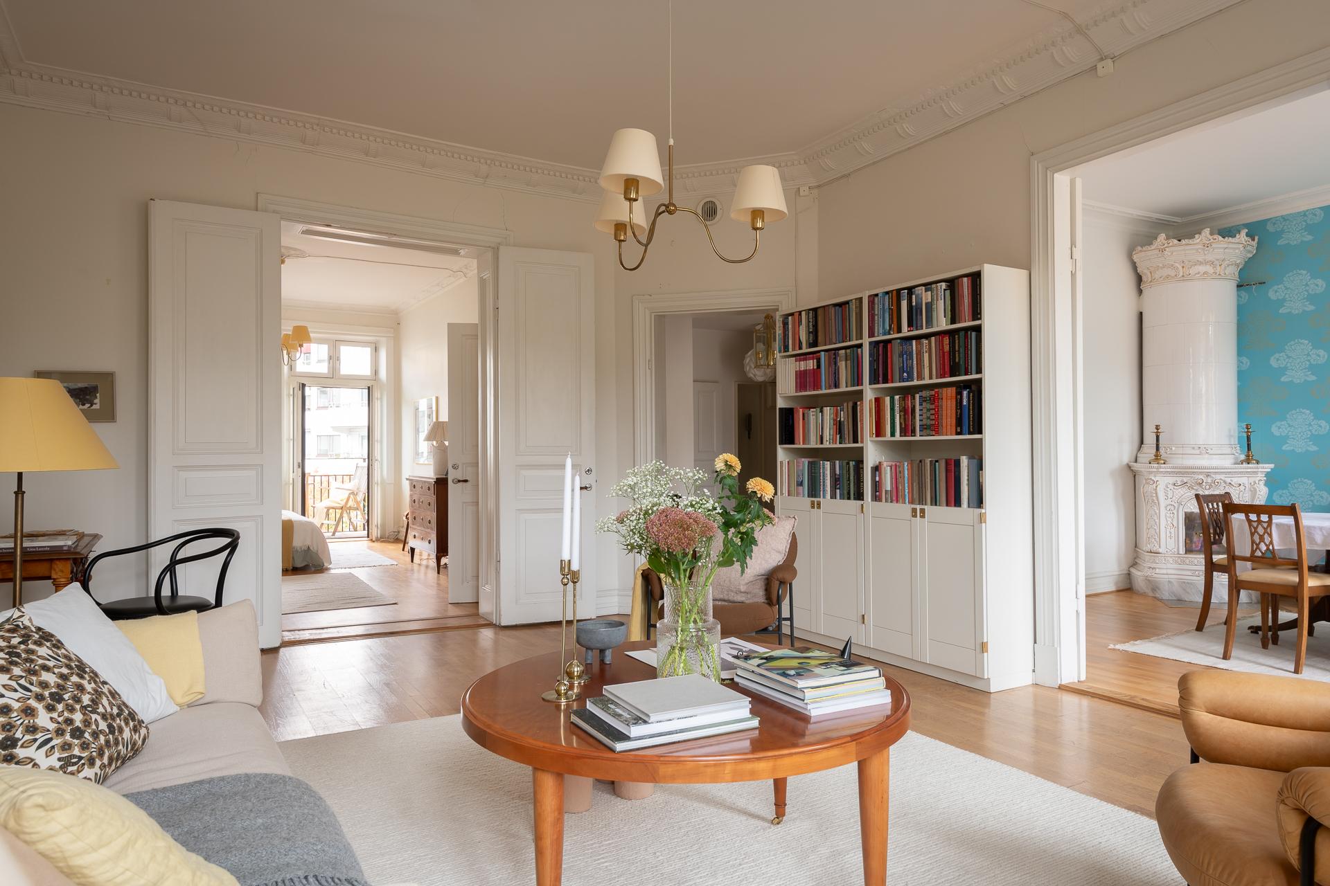 Stilfull sekelskiftestrea om 100 kvm fritt belägen mot grönskan på våning 4 av 6 med hiss (stannar på halvplan)Två fantastiska balkonger - en i öst och eni väst med sol från morgon till sen kväll. Många höga fönster gör detta hem oerhört ljust. Vacker kakelugn, stuckaturer, pardörrar och takrosetter. Möjlighet att flytta kök och skapa ditt egna drömboende!