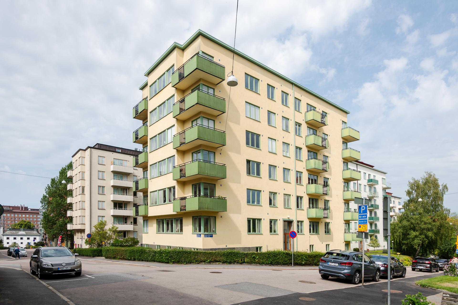 I ett av Göteborgs stiligaste funkishus finner vi den här ljusa och välplanerade hörntvåan med fina originaldetaljer. Det är en perfekt lägenhet för sociala tillställningar och i det rymliga vardagsrummet, med fantastiskt hörnfönster, finns det plats för många gäster. Ett mycket trivsamt boende erbjuds, och på husets tak har föreningen en solig terrass med storslagen vy över staden bort mot blånande höjder i fjärran. Läget är perfekt och här bor man lugnt och avskilt i grönskande kvarter strax ovanför Avenyns puls. Välkommen på visning !
