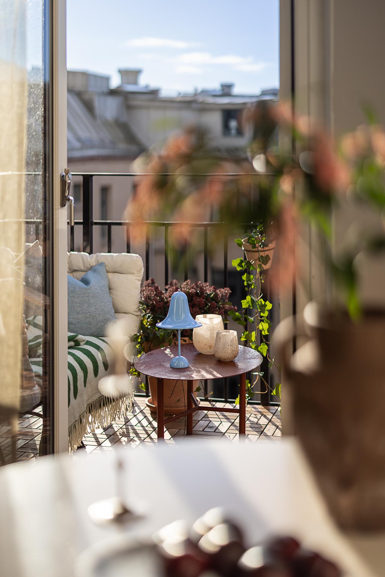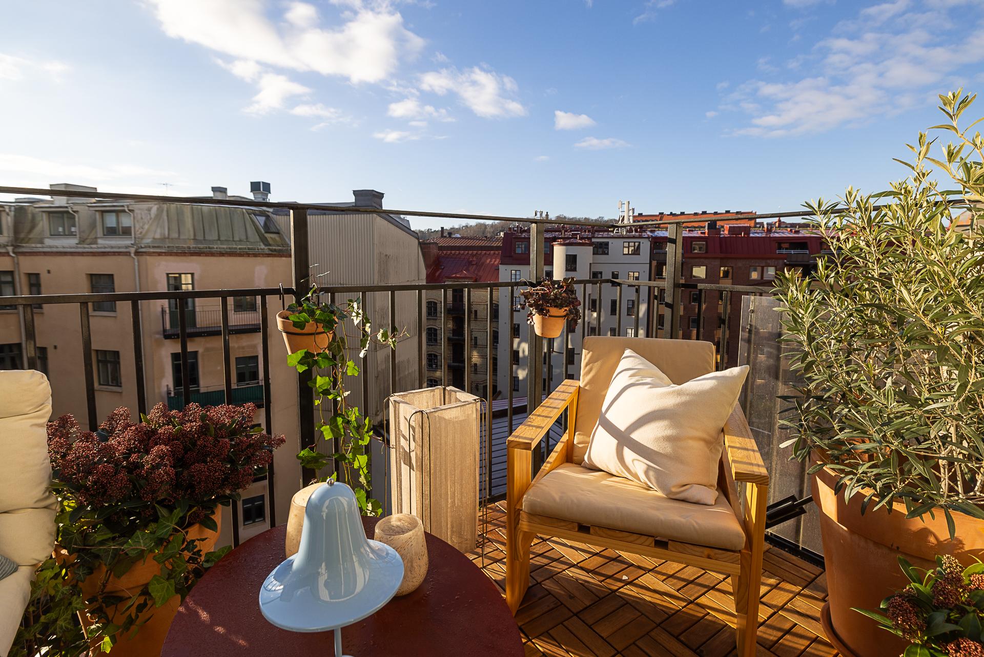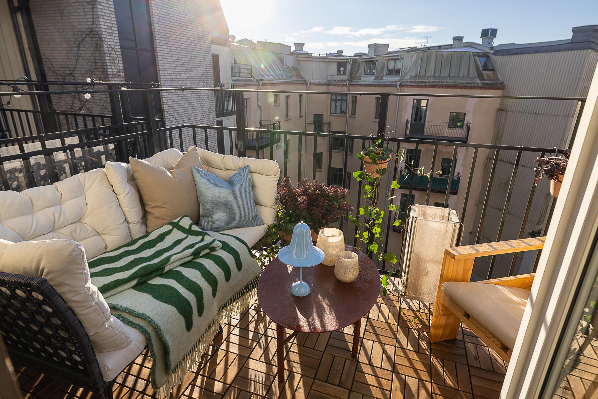 * Stor söderbalkong med glasade dörrar och sol från förmiddagen till kvällen.