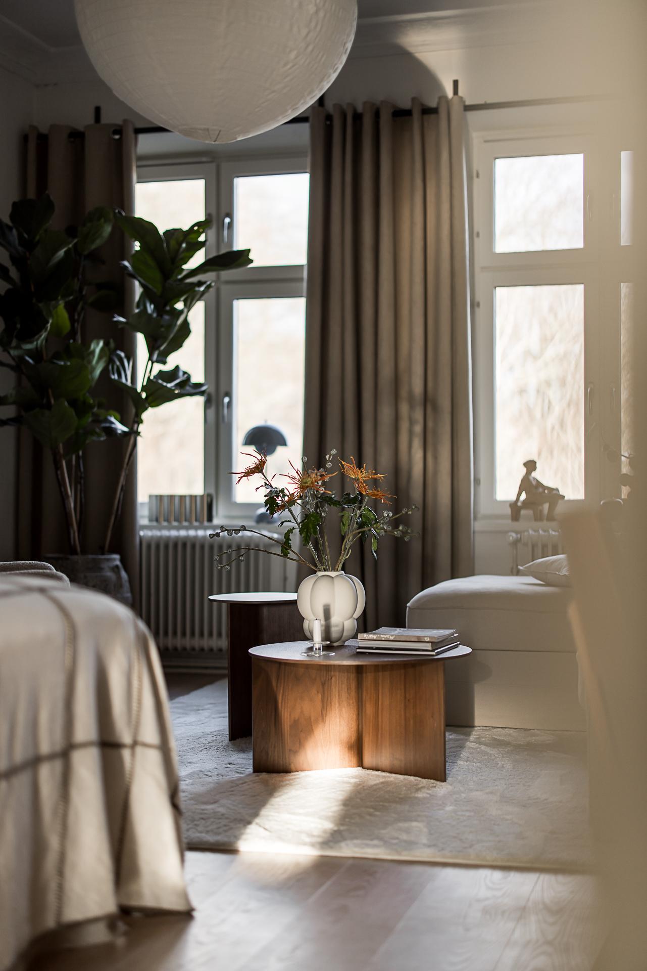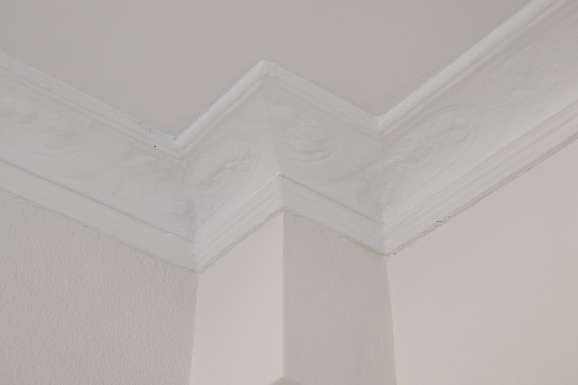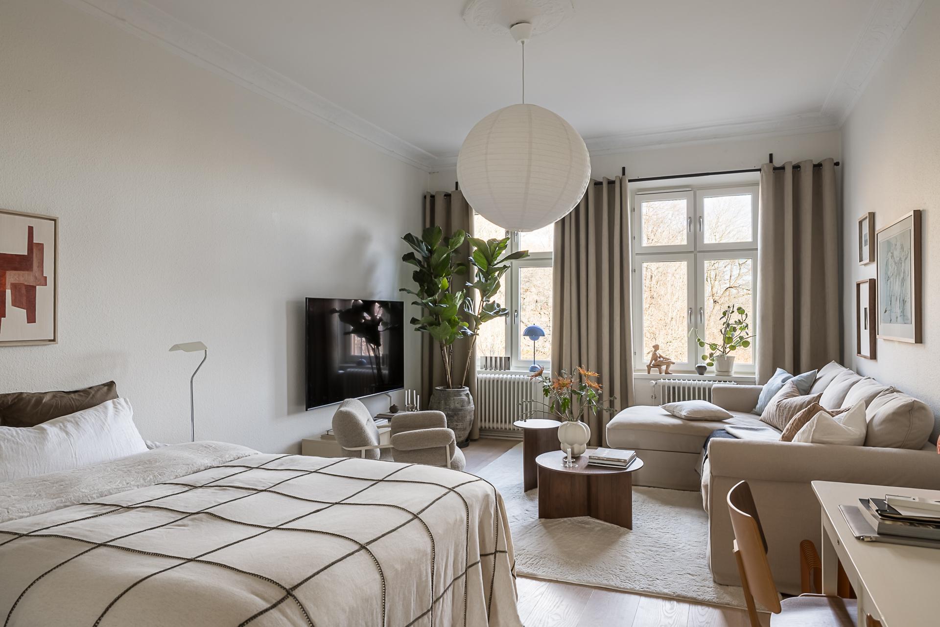 Stort och mycket luftigt rum med rejäla fönster mot himlen och grönskan på Skansberget. Här ryms både en bredare säng med tillhörande nattduksbord, bokhylla, soffa, tv-möbel och läshörna. Väggarna är målade i en bruten vit nyans och golvet pryds av samma enhetliga vitbehandlade askgolv. Detta ger en neutral och ljus bas att inreda efter. Dryga 3 meter i takhöjd. Taket pryds av stuckatur och takrosett. Två höga fönster med överljus i en djup fönsternisch ger ljuset spelrum och en härlig vy över grönskande Skansberget och staden. Höga fotlister och fina listverk är andra vackra detaljer som hör husets ursprung till.