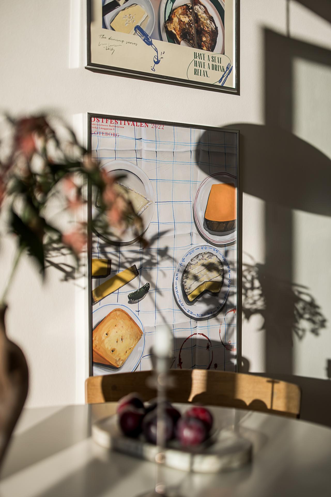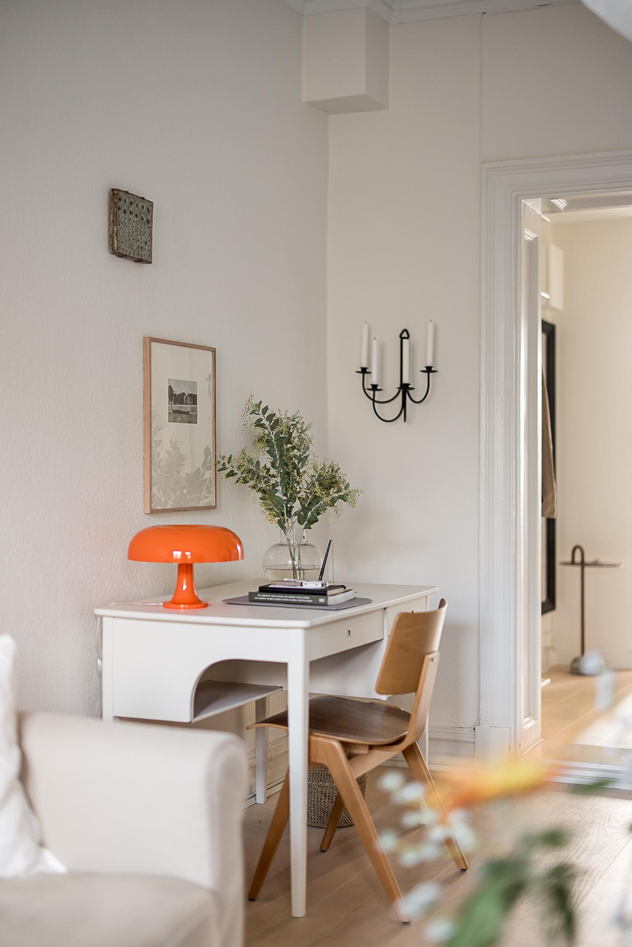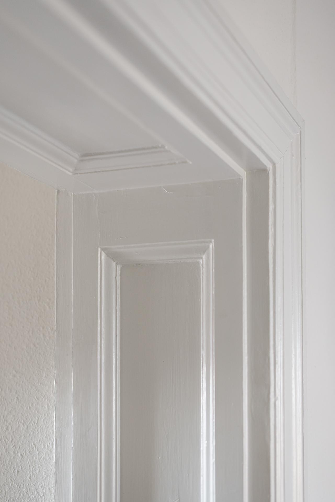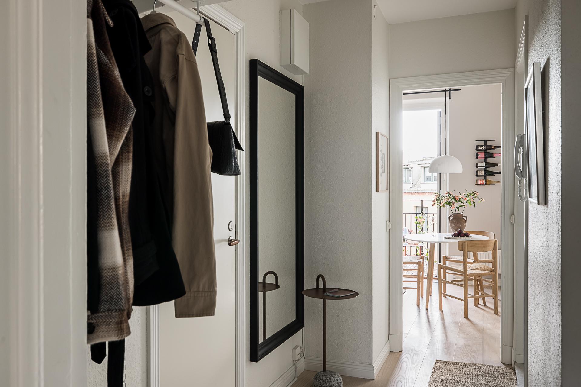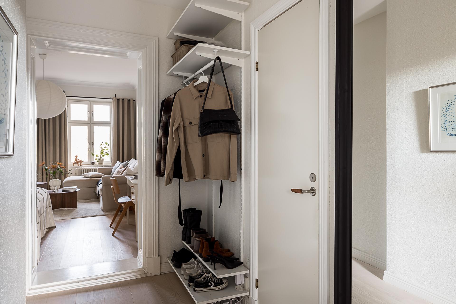 Efter att ha passerat det fint renoverade trapphuset i tidsenlig stil välkomnar en ljus och fräsch hall med ljusa väggar och ett vitbehandlat askgolv. Ljuset strömmar in från båda håll och gör att det känns trivsamt och välkomnande. Hallen fungerar som navet i lägenheten där man når både köket, vardagsrummet och badrummet. Väggarna är målade i en bruten vit nyans.