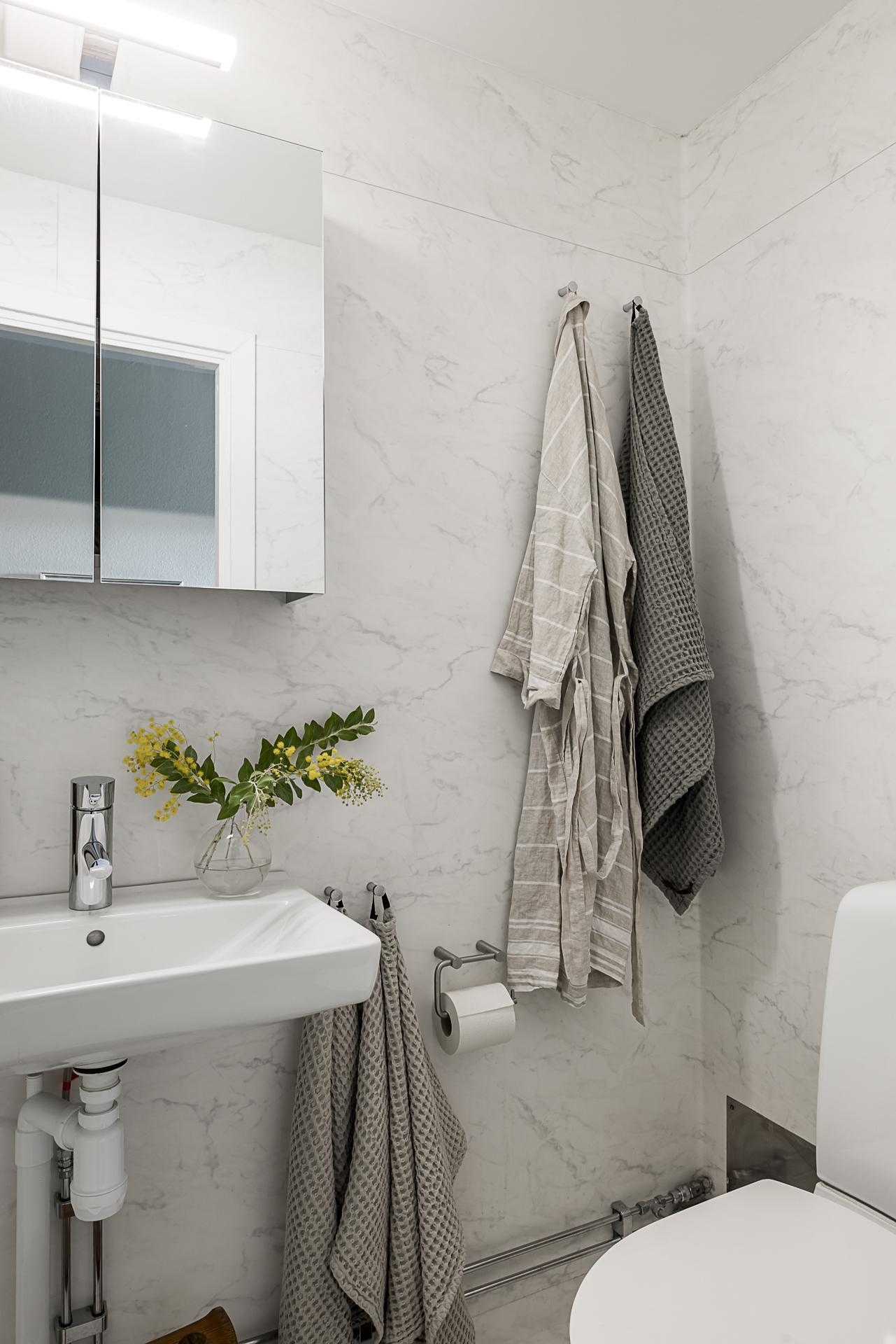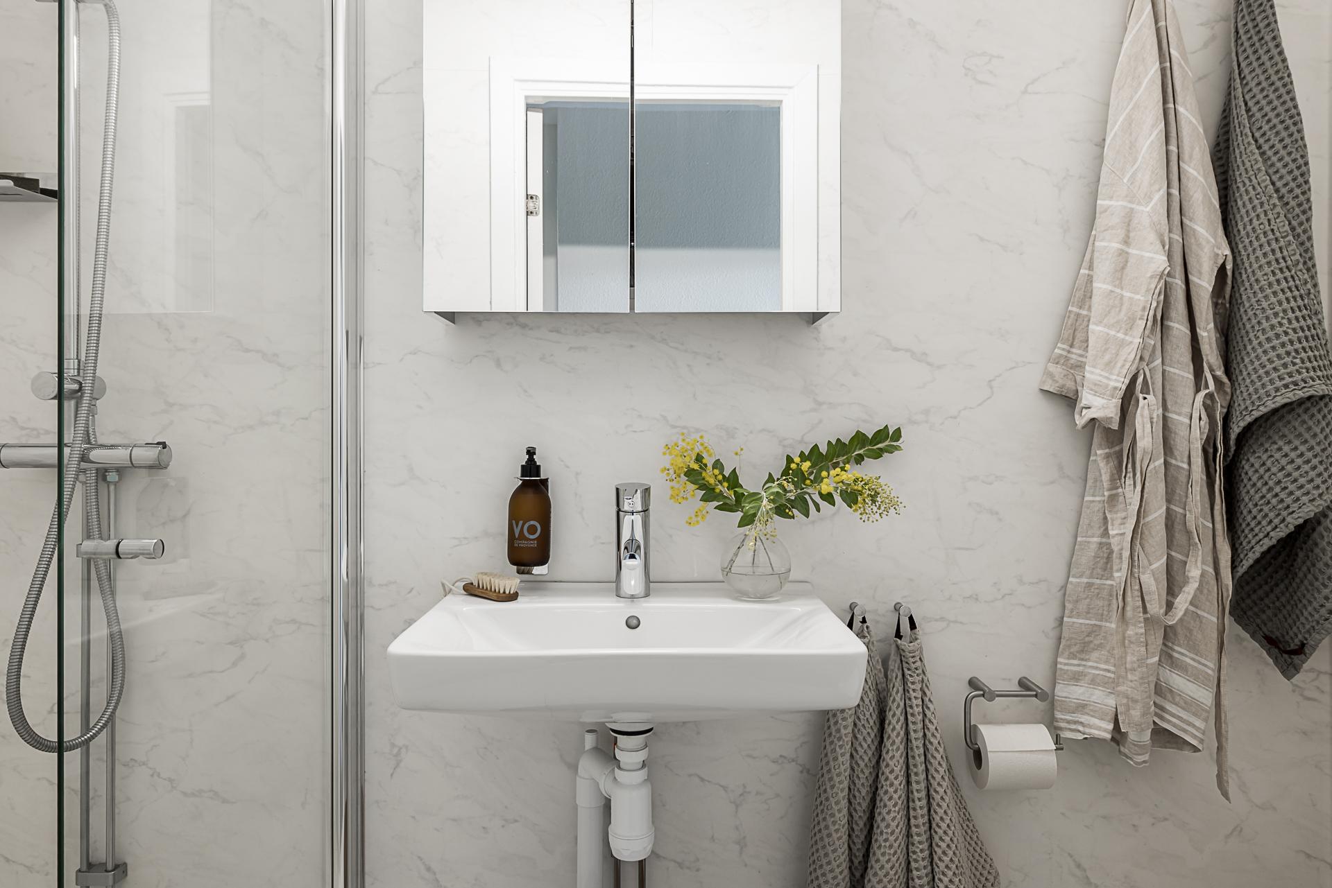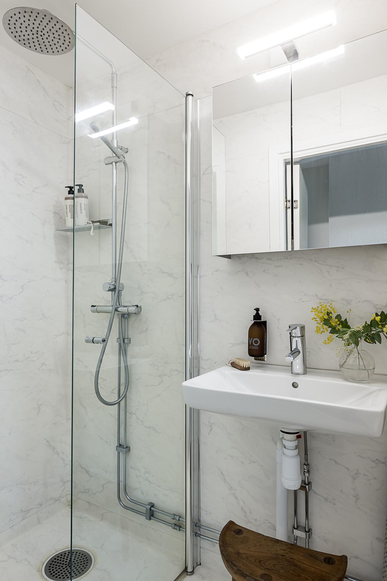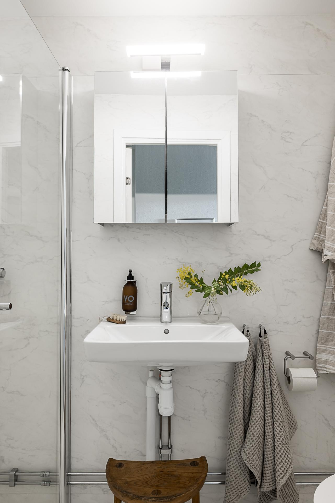 I direkt anslutning till hallen ligger badrummet som renoverades enigt konstens alla regler så sent som 2021. Väggar och golv är klädda med en våtrumsmatta lik Carraramarmor. Till vänster finns en dusch som snyggt avskiljs med en glasvägg och rakt fram finns ett handfat med översittande spegelskåp. Till höger om handfatet finns en wc-stol.