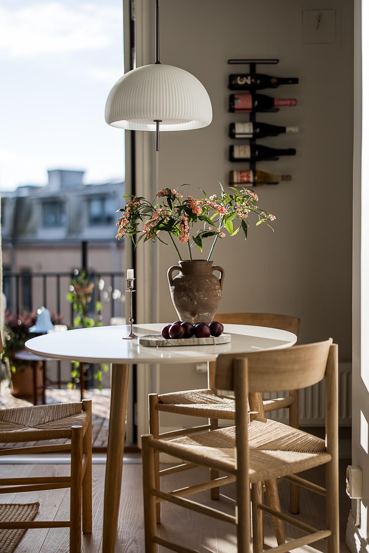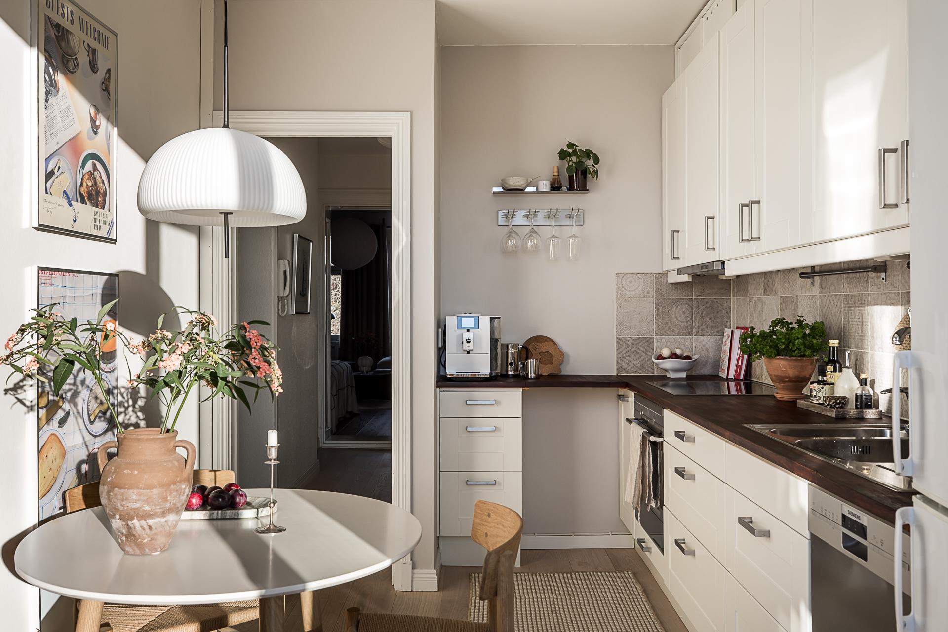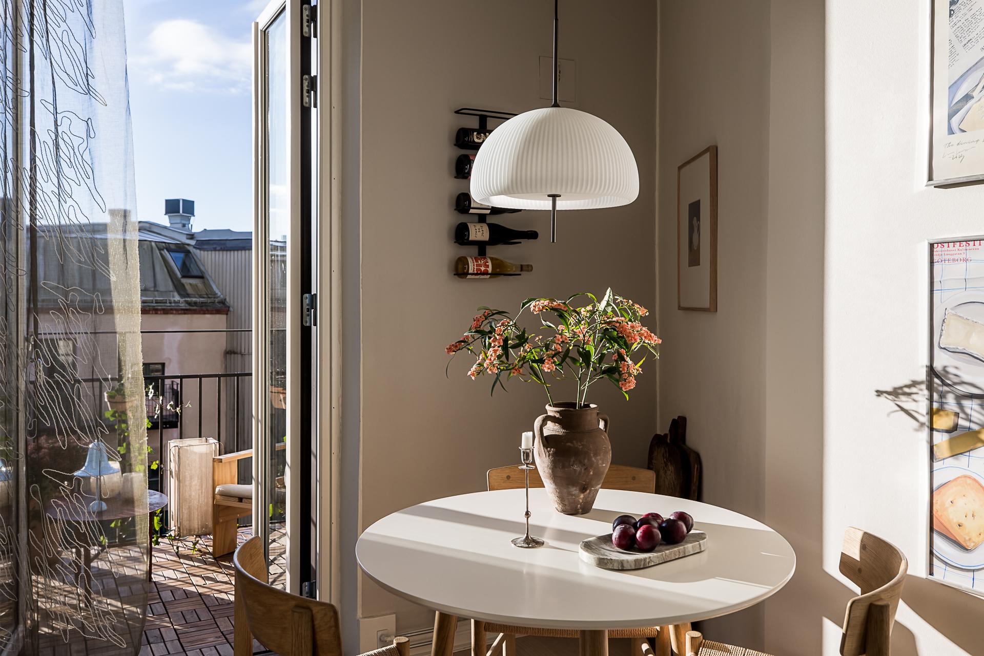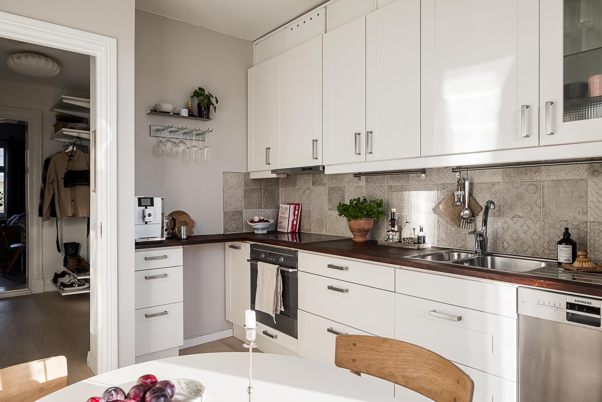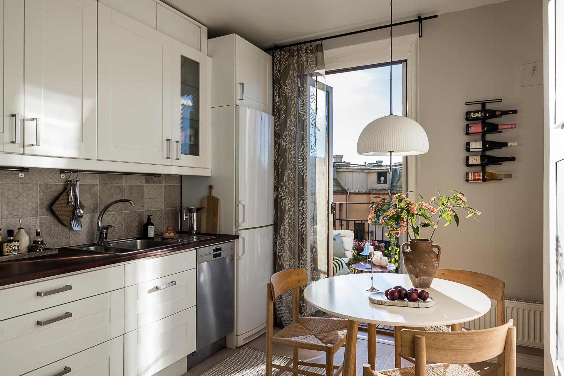 Oerhört hemtrevligt renoverat kök med glasade pardörrar mot den soliga balkongen. Nedanför fönstret blommar det japanska körsbärsträdet som ett hav i rosa om våren och det generösa ljusinsläppet gör köket riktigt ljust. De glasade balkongdörrarna suddar effektivt ut gränsen mellan inne och ute och balkongen blir utan tvekan en förlängning av köket. Med sitt fria och lugna söderläge är detta ett extrarum där både frukost, middag och kvällsmat intas. Bara att kunna öppna upp och sätta sig med en bra bok är en vardagslyx som är svår att finna i en storstad. Måttet på balkongen är 2,60 m x 1,60 m och räcket av svart smide. Själva köksinredningen går i vitt med profilerade luckor i form av över- och underskåp i vinkel. Ovanför köksbänken av massivt trä sitter ett grått mönstrat kakel. Allt är snyggt upplyst av downlights. Den maskinella utrustningen består av kyl/frys, spishäll med ugn och översittande fläktkåpa samt en 40 cm bred diskmaskin. Intill en charmigt oregelbunden vägg finns plats för ett bord för tre-fyra personer.