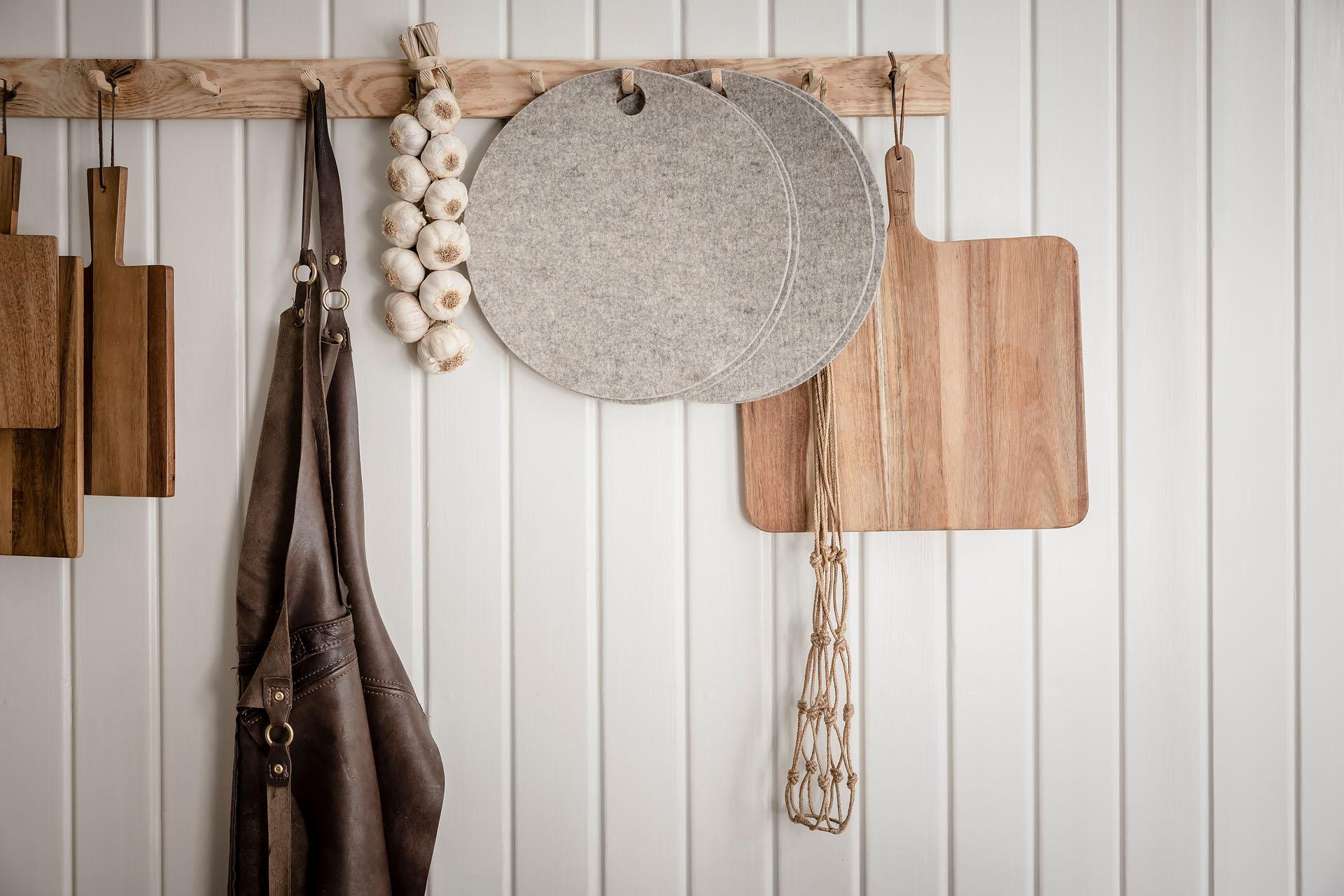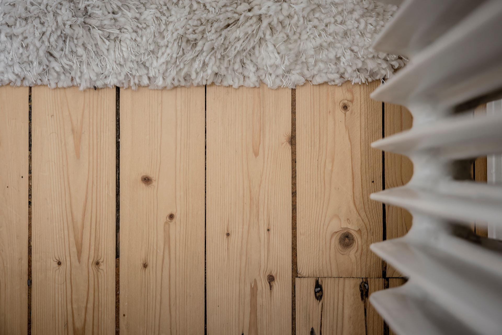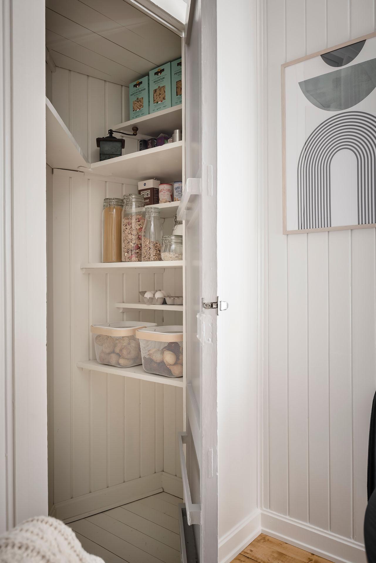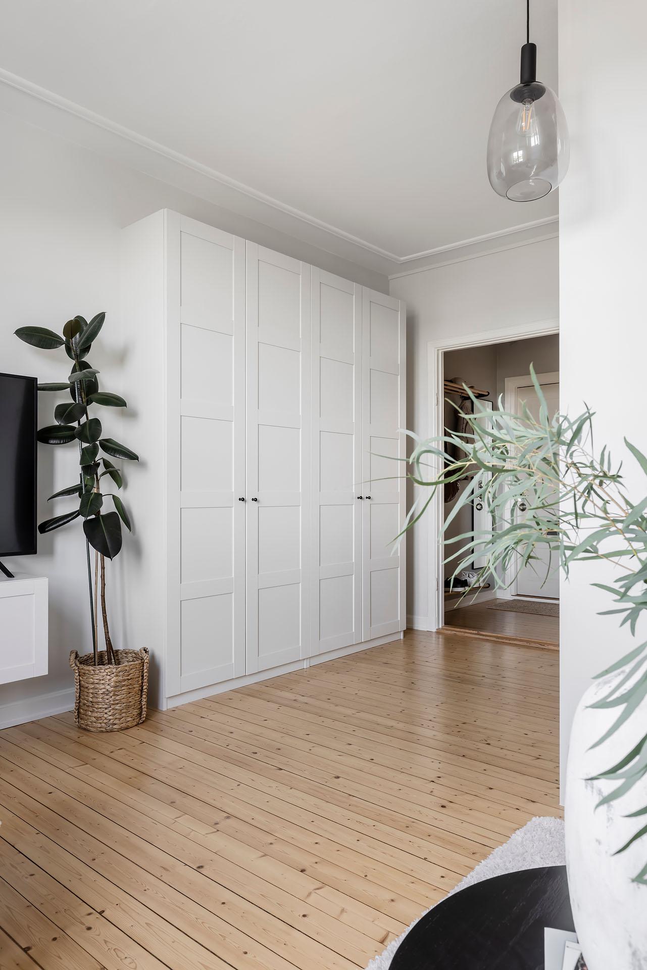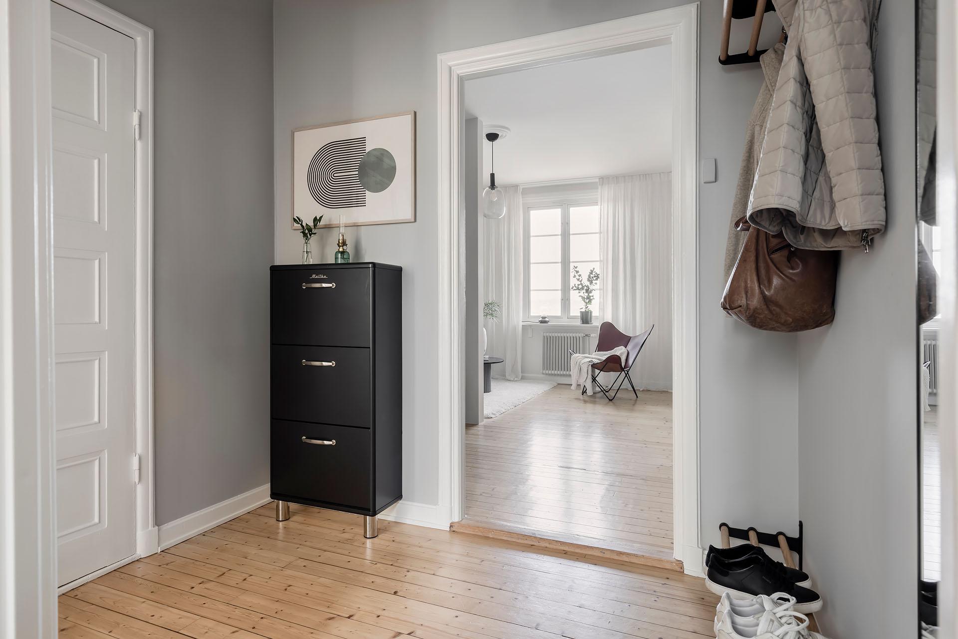 Hallen är centralt placerad i lägenheten. Här finns naturlig plats för avhängning, och om du önskar dig stängd förvaring finns en bra plats för att bygga en dubbelgarderob. Brädgolvet som möter upp oss här kommer igen i båda de intilliggande rummen. Väggarna är målade i Alcros kulör "Lammöra".