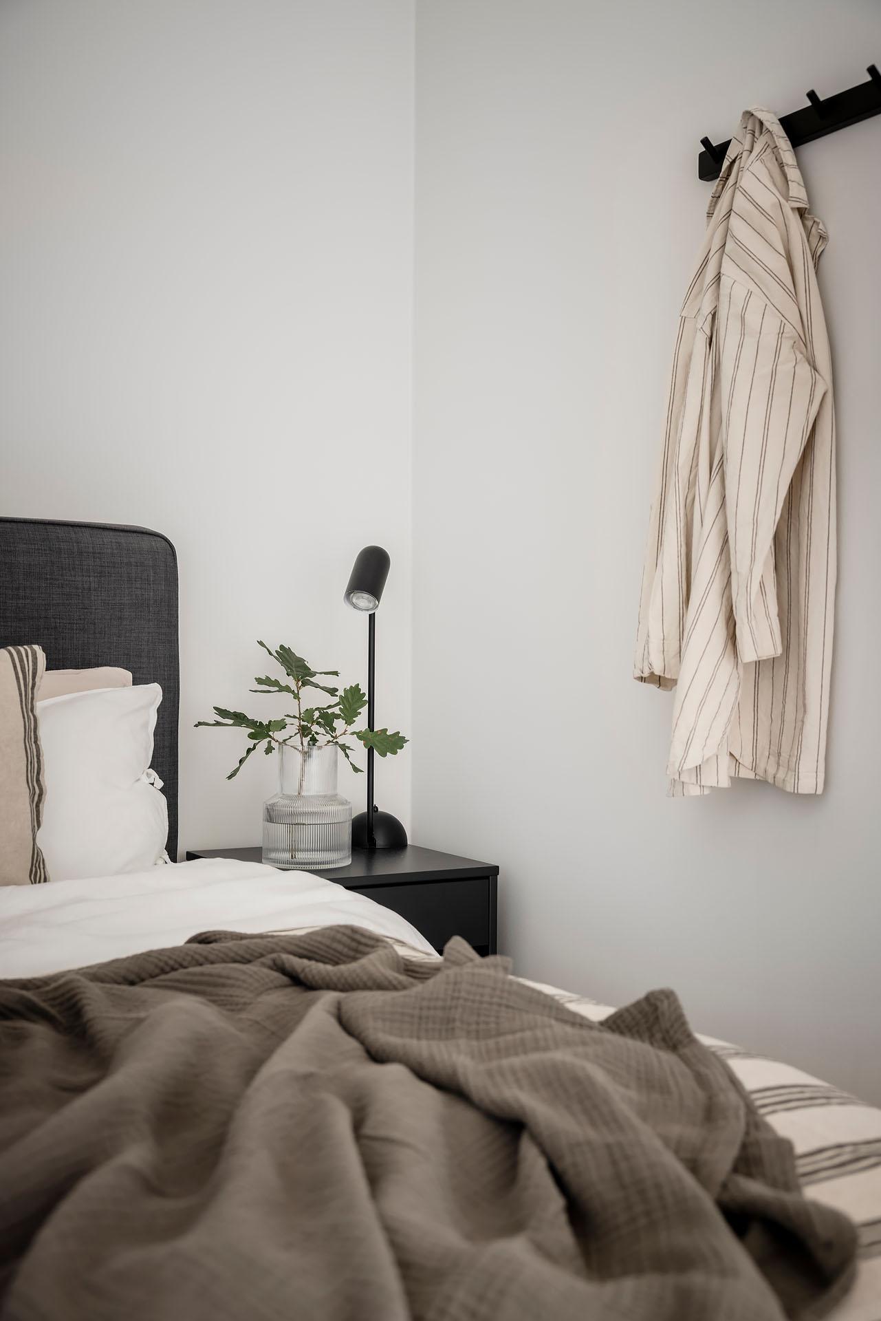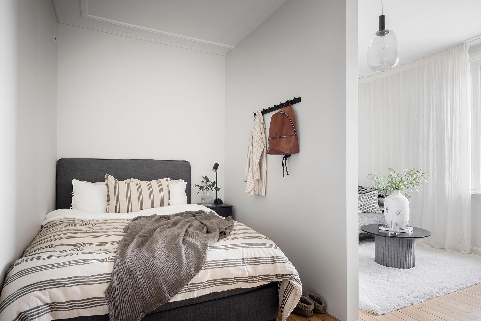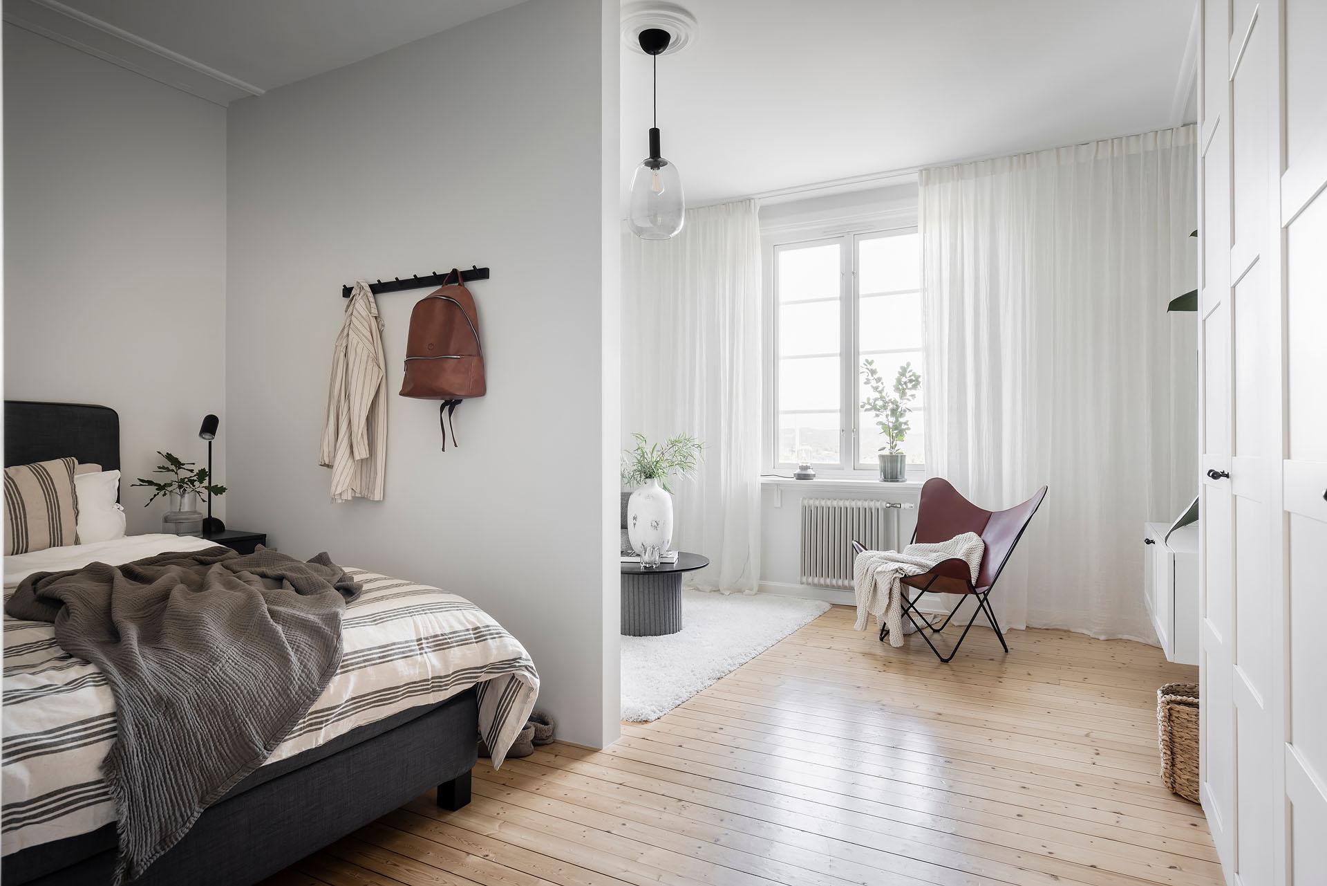 I det luftiga rummet har en avskild avdelning för sömn skapats genom att en vägg fått dela av rummet. Det är ett väl till tilltaget rum med högt i tak, så även med väggen är känslan att här är gott om plats. Sovalkoven är i dagsläget möblerad med en 140 cm bred säng, men ytan medger även fullstor dubbelsäng om så önskas. På motsatt sida alkoven har två dubbelgarderober byggts, som sväljer allt i klädväg.