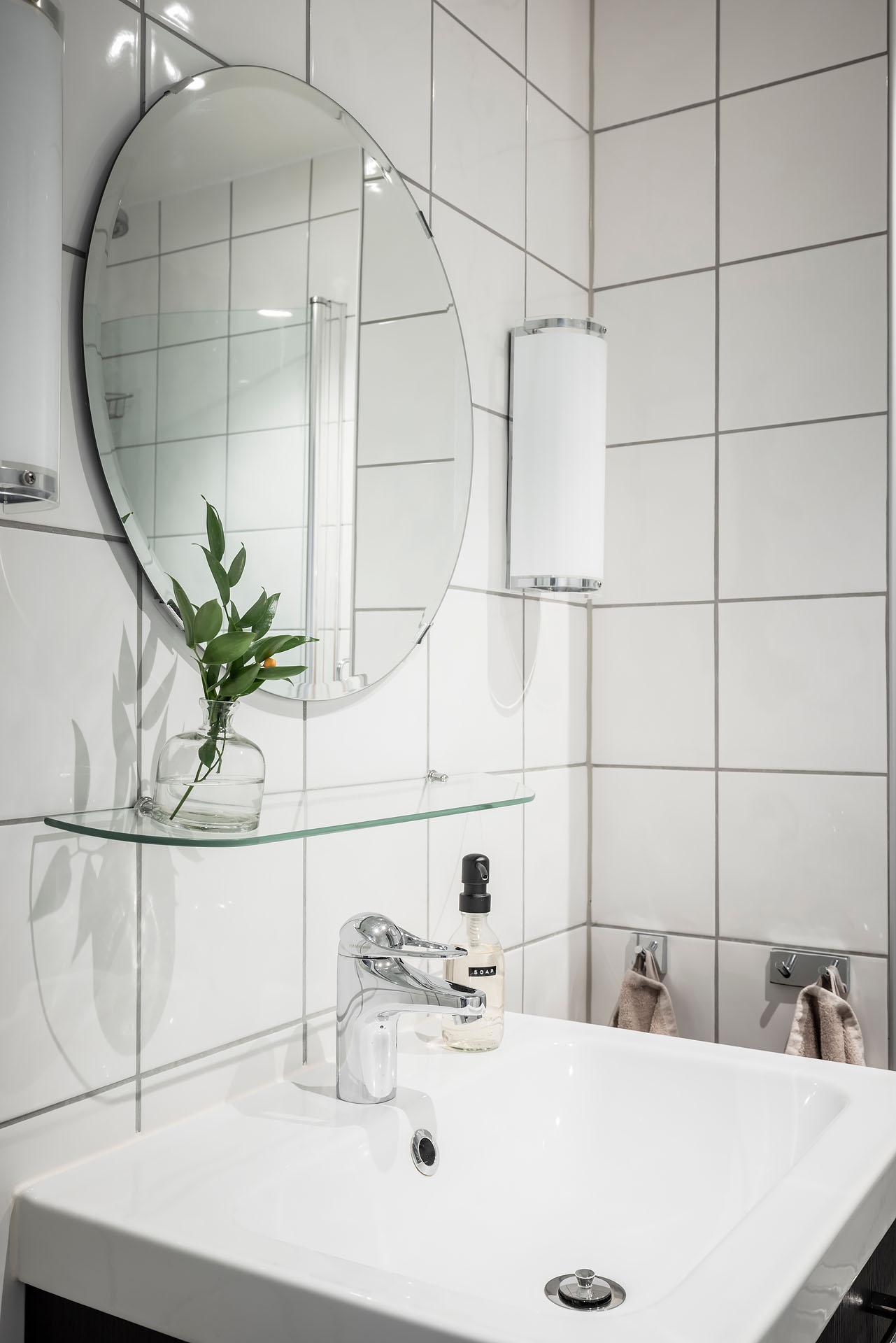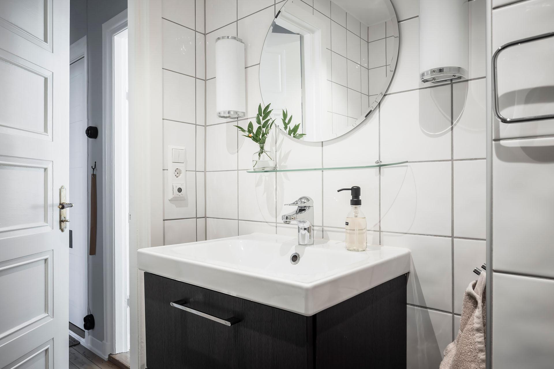 Badrummet renoverades 2015 i föreningens regi. Helkaklade väggar i vitt, och mörkt klinkergolv med värme. Duschhörnan är praktiskt placerad bakom invikbara väggar i klarglas, och utrustad med takduschset. Handfatskommoden med lådor ger gott om förvaring.