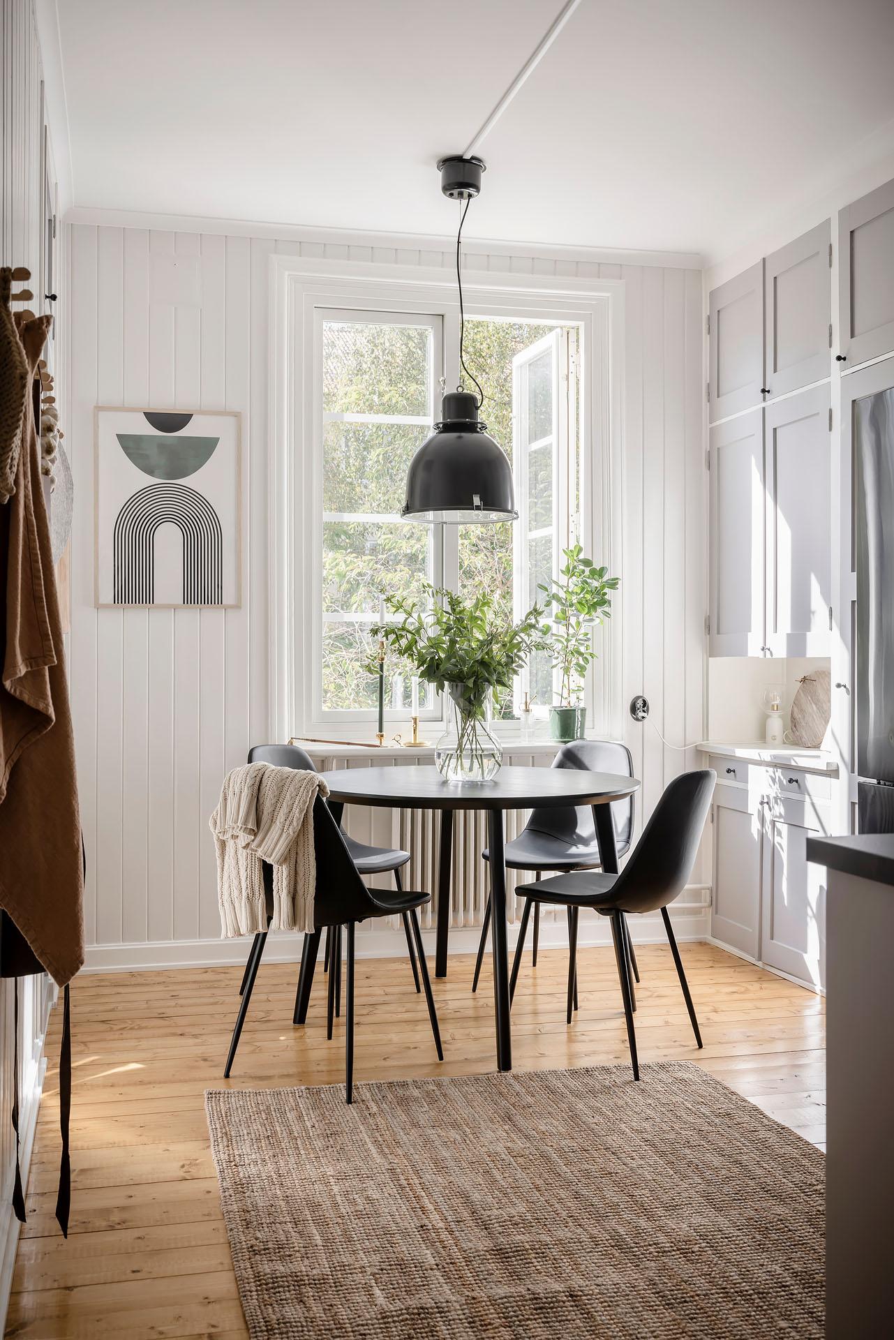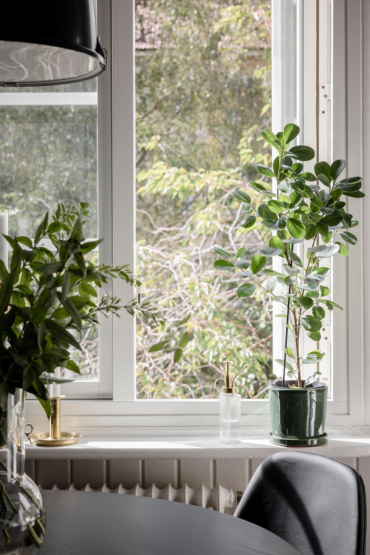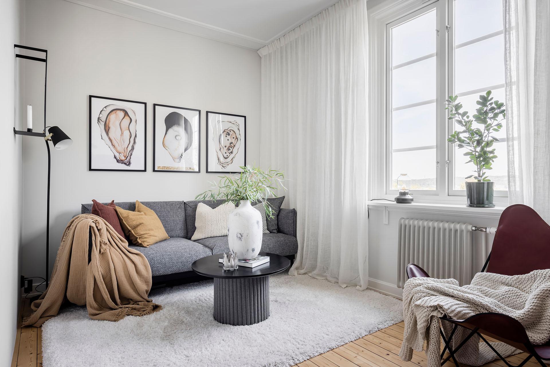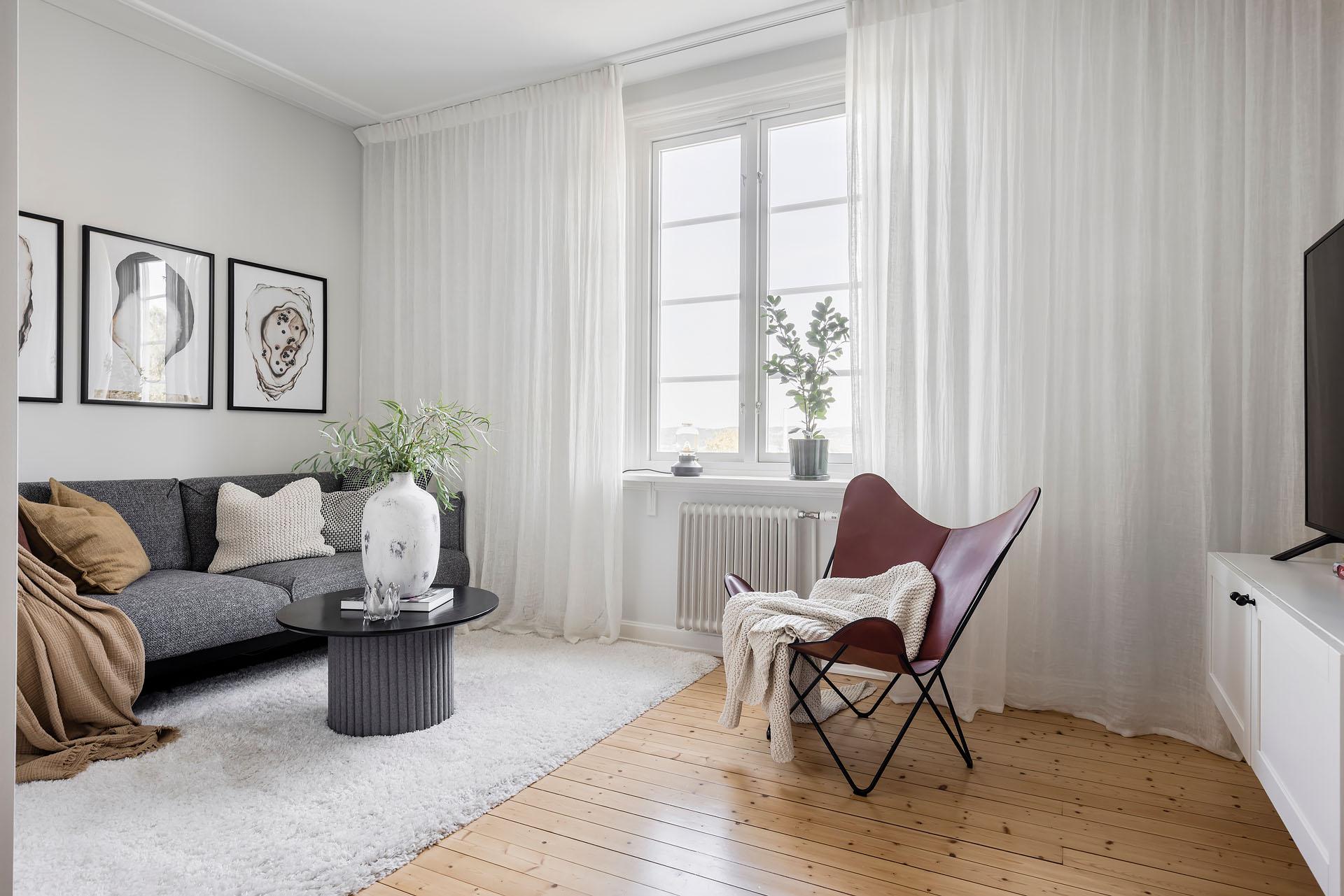 Ytan invid fönstret är dedikerad till vardagsrumsmöblemanget. Det vägghängda skåpet som utgör tv-bänk lämnas gärna kvar till nästa ägare. Den svala väggfärgen, Ebba Grey från Alcro, ackompanjerar trägolvet på ett smakfullt vis. Fönstret vetter mot Sofiagatan, och bjuder på en svårslagen utsökt som sträcker sig ut över kolonilotterna och bort över skogen i horisonten.