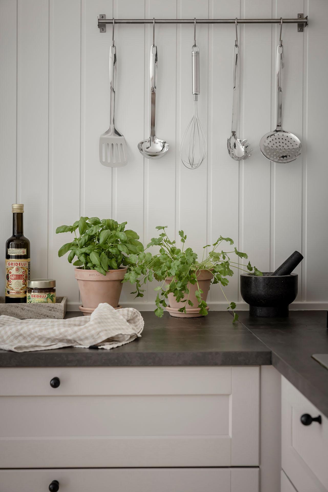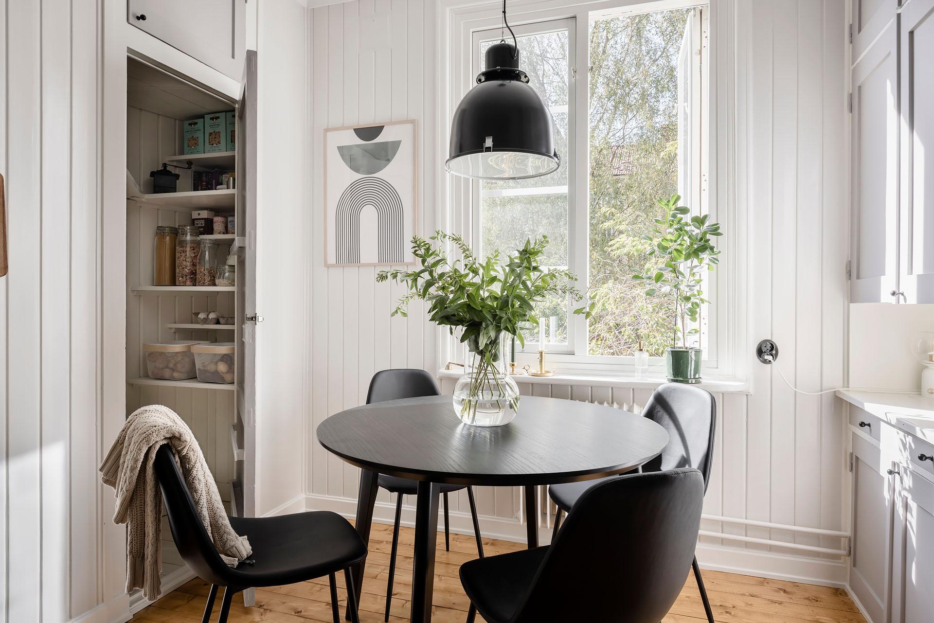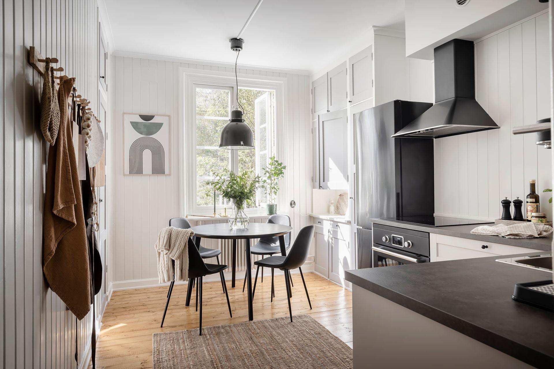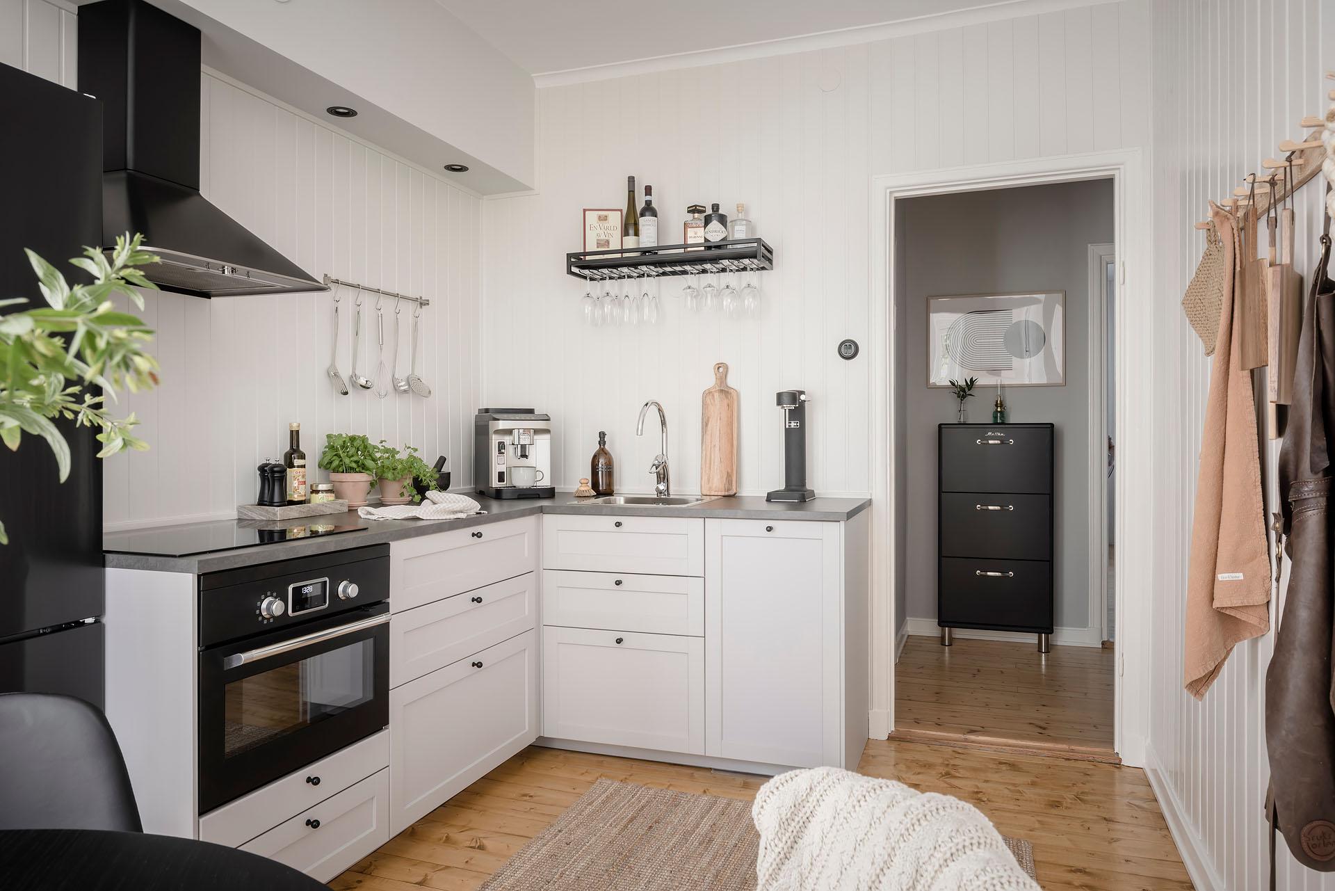 Ett ljuvligt, stort kök med gott om yta både för att laga maten som att äta den. Köket totalrenoverades så sent som 2023, och är i det bästa av skick. Det L-formade köket ger generöst med både arbetsyta och skåpsförvaring. De nya köksskåpen är i gott sällskap av serveringsskåpet (som enbart finns bevarat i ett fåtal av föreningens lägenheter) och kallskafferiet. Den maskinella utrustningen består av kyl/frys, induktionshäll, kombinerad ugn/micro, kolfilterfläkt, och diskmaskin (allt från Ikea, 2023). Köksfönstret vetter mot den lummiga gården, och träden utanför silar solljuset som skiner in här under större delen av dagen. Brädolv, och panelbeklädda väggar målade i "Ebba Grey".