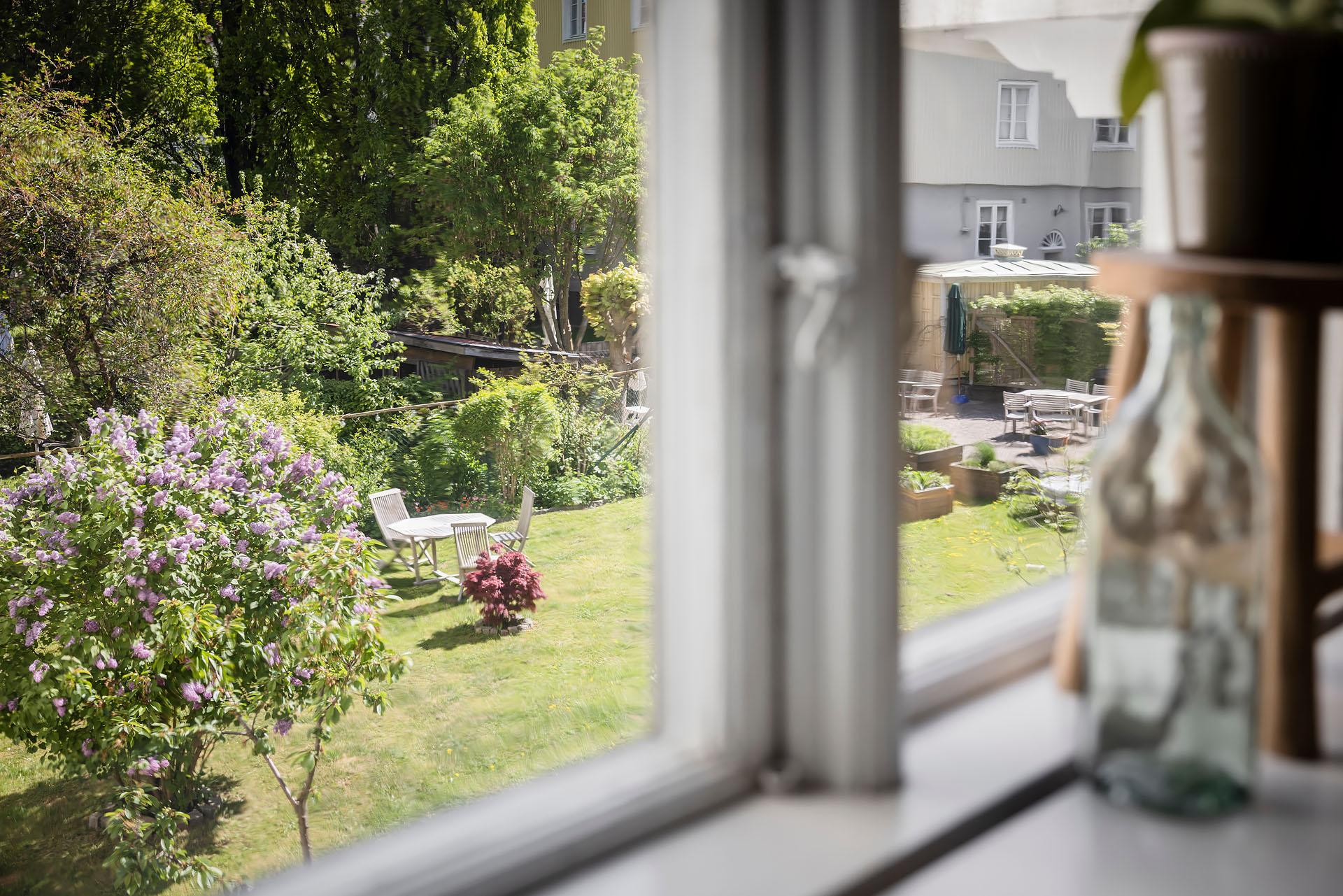 - Balkong/Uteplats: Nej. Gemensam innergård med uteplats, odlingslådor, fruktträd och rabatter.