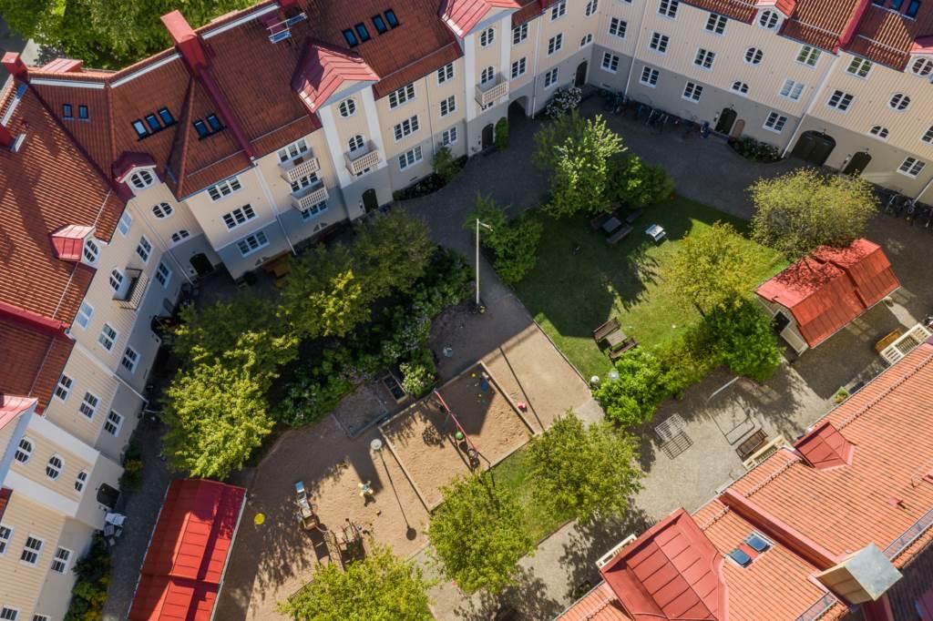 - Balkong/Uteplats: Ja. Gemensam innergård med träd, buskar, lekplats och uteplatser.