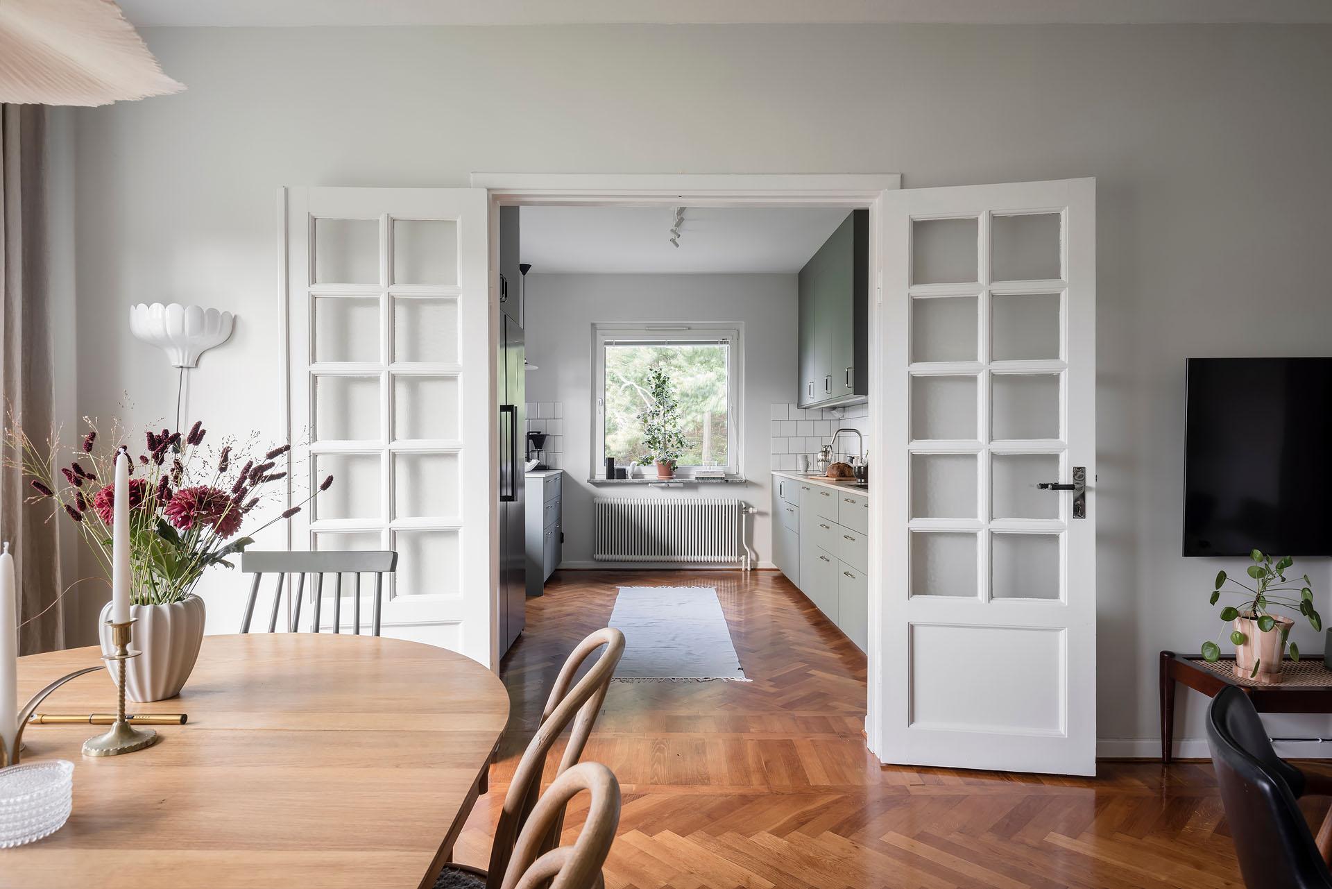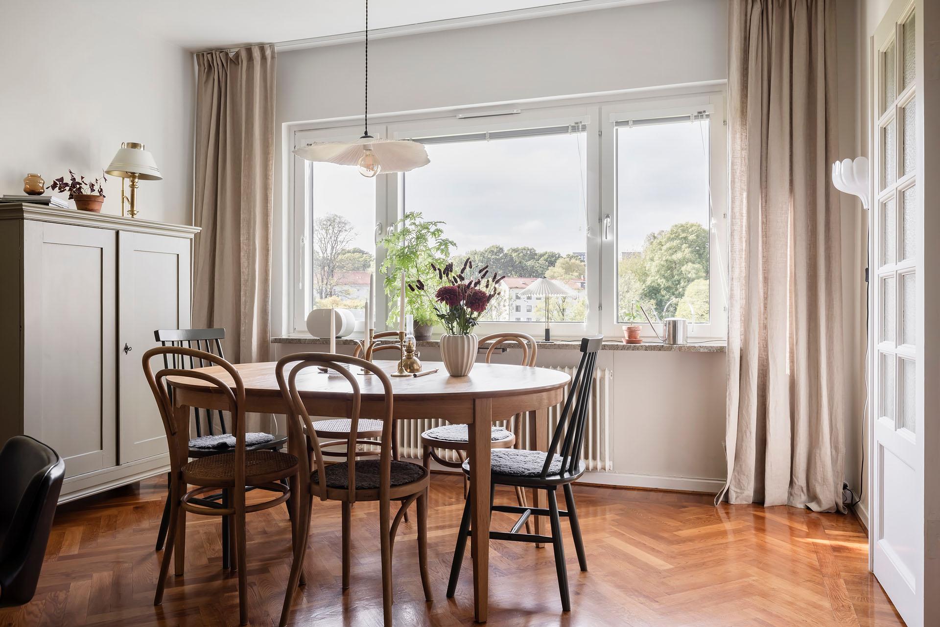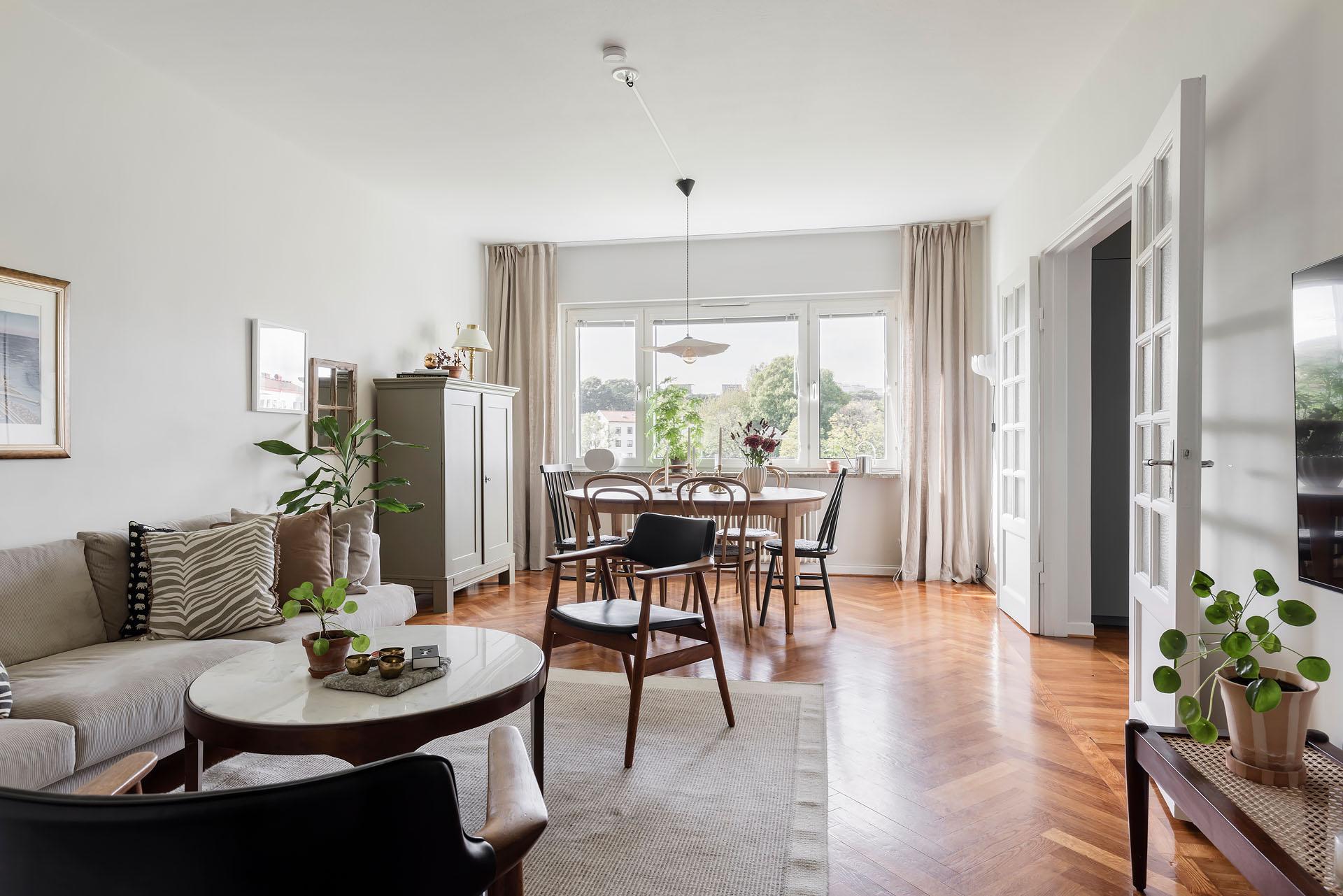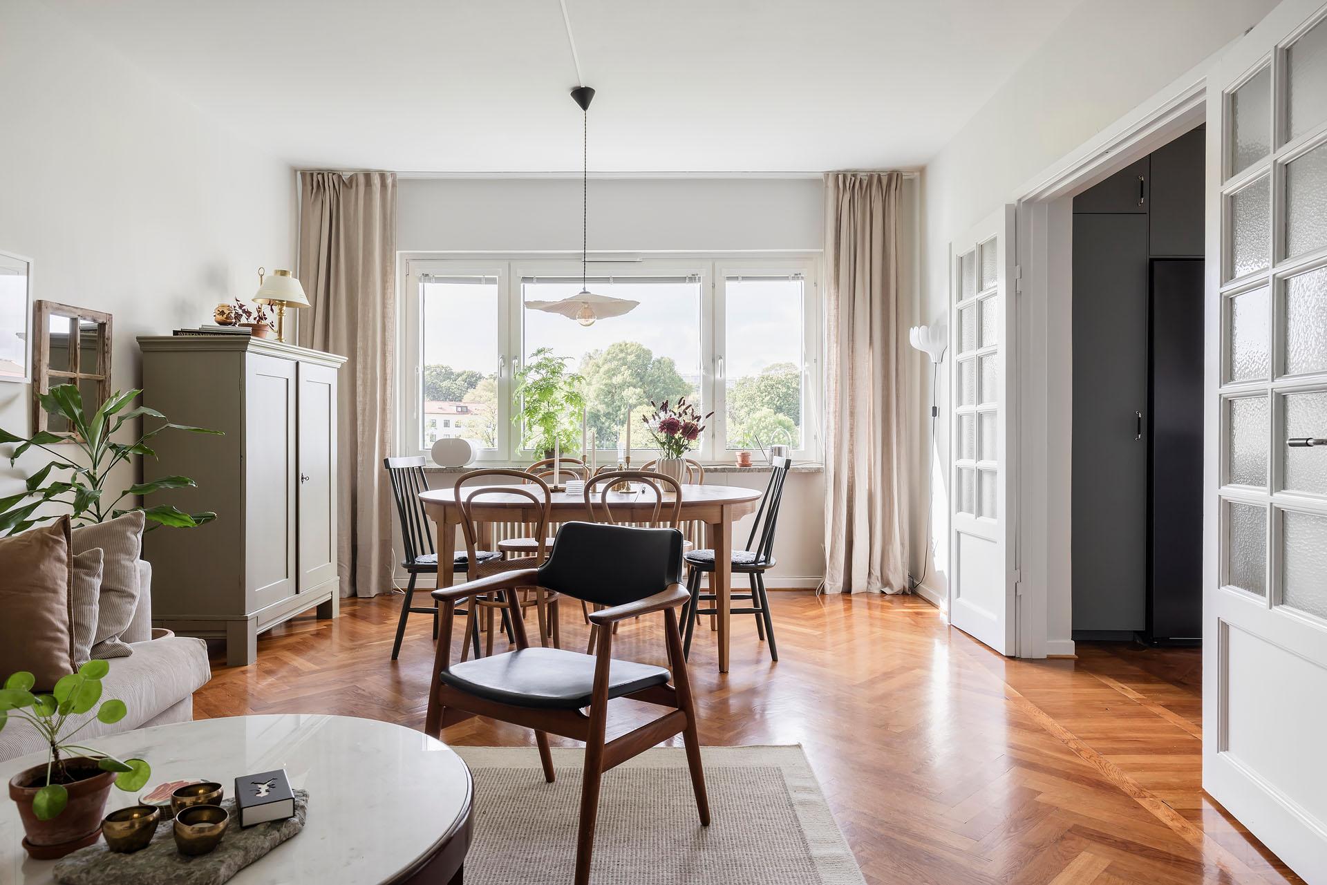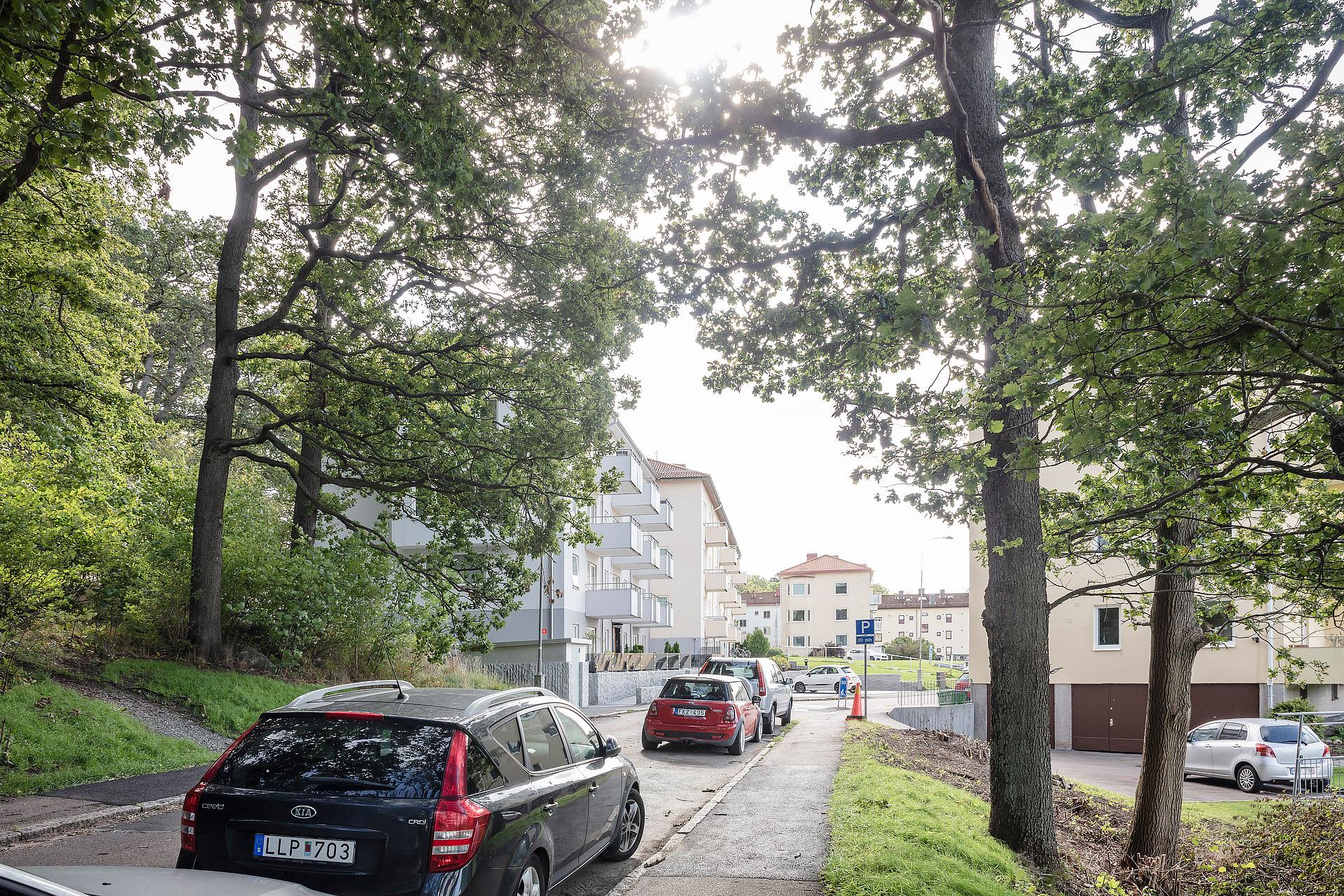 Fönster i tre väderstreck fyller den här ombyggda och smakfullt renoverade gaveltrean med ljus. Från vardagsrummet, köket och den stora balkongen med härlig kvällssol är det fri utsikt över en lummig grönyta. Lägenheten bjuder in till umgänge, och i vardagsrummet finns det plats för att duka upp till trevliga middagar med många gäster. Den breda öppningen mot köket ger känslan av en öppen planlösning samtidigt som pardörrarna med spröjsade fönster gör det möjligt att skilja av. Läget är svårslaget, och här erbjuds ett lugnt, avskilt och barnvänligt boende med naturen som närmaste granne. Promenadvägar genom skogen leder fram till picknickparadiset Apslätten, Skatås motionsområde och Härlanda tjärns badplats. Tillträde: flexibelt. Varmt välkommen hem!